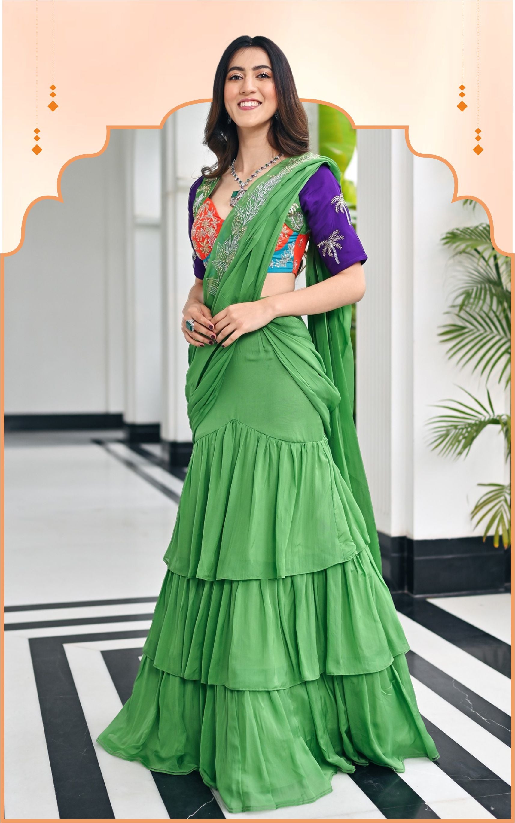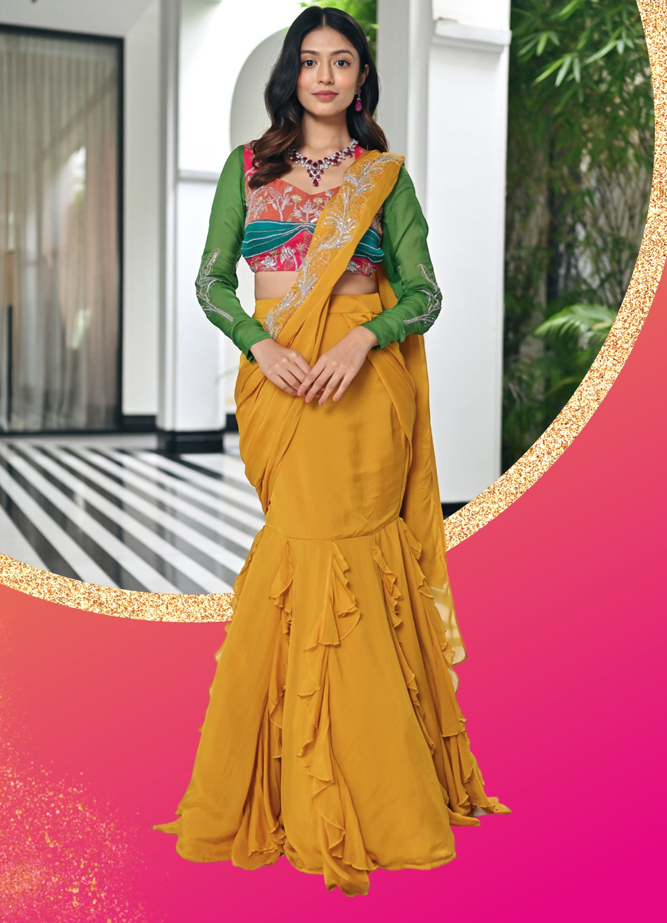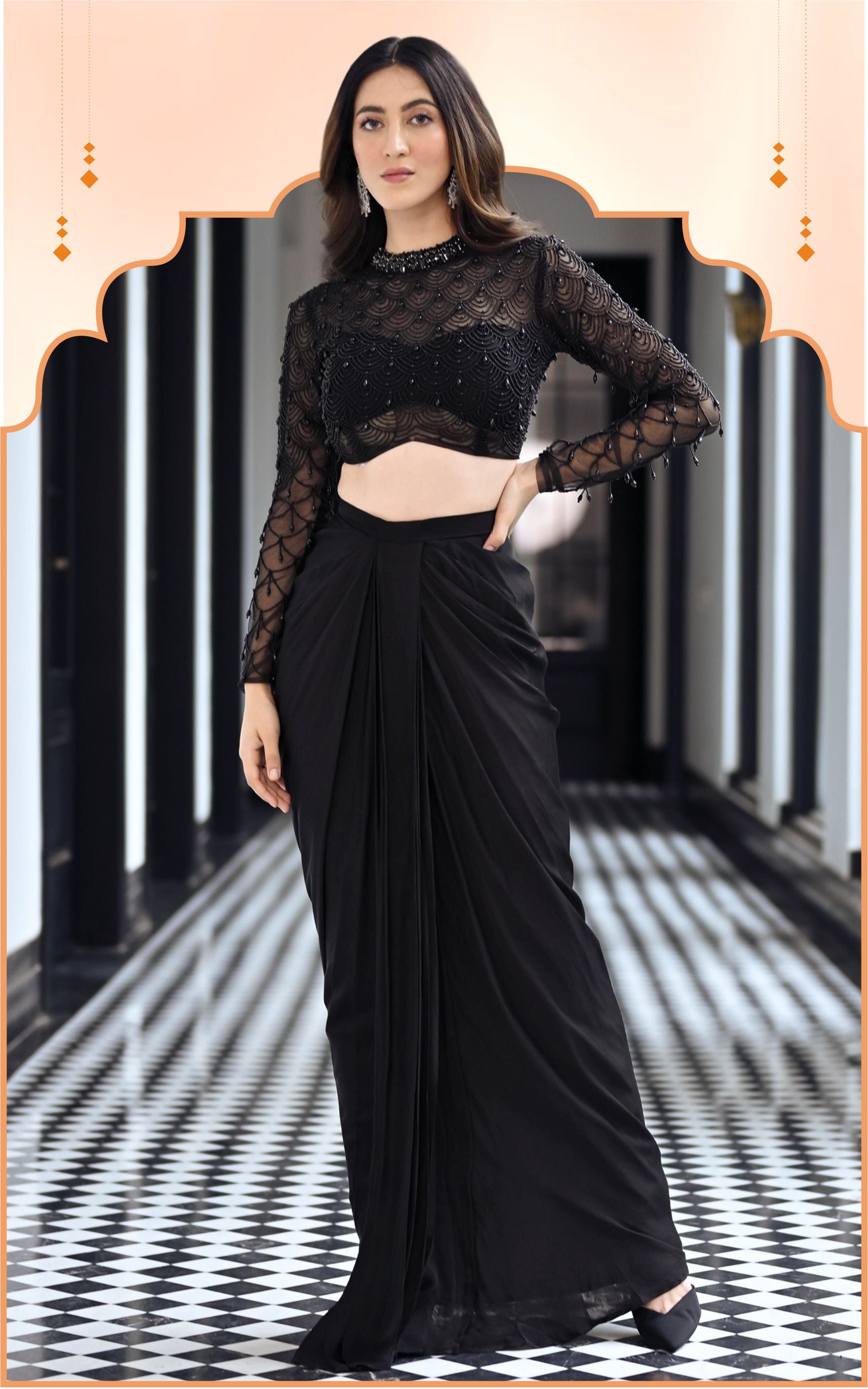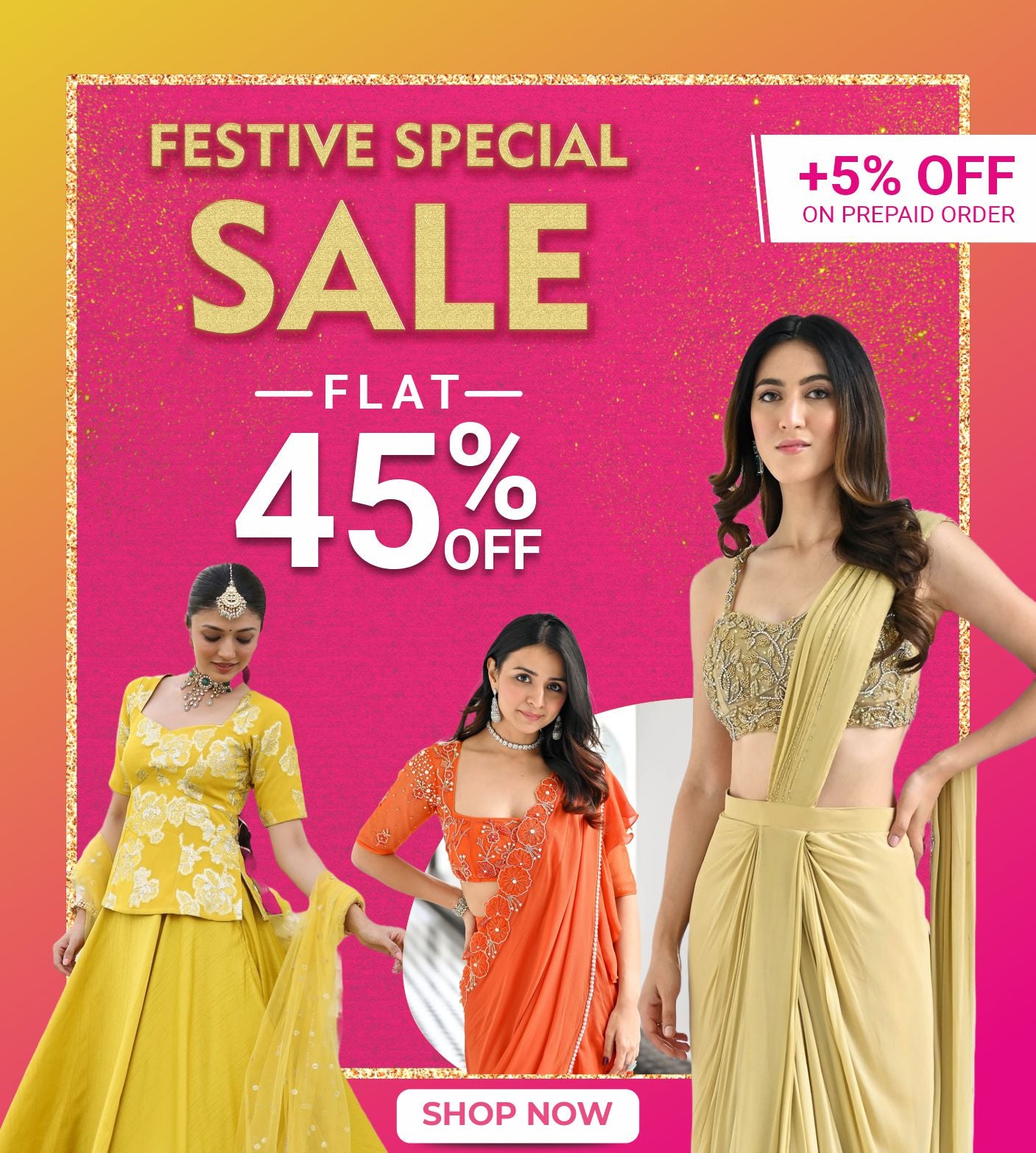 We present you timeless styles in sarees crafted in a wide range of colors, silhouettes, prints, and patterns. Our fabrics blend grace and sophistication in a perfect style. You can wear our sarees to weddings, social gathering, festivals, evening party, or special events. We offer different styles in sarees: ruffled, pleated, draped, ready to wear, sharara, and pre-draped. Browse our designer sarees collection and buy your favorite one.