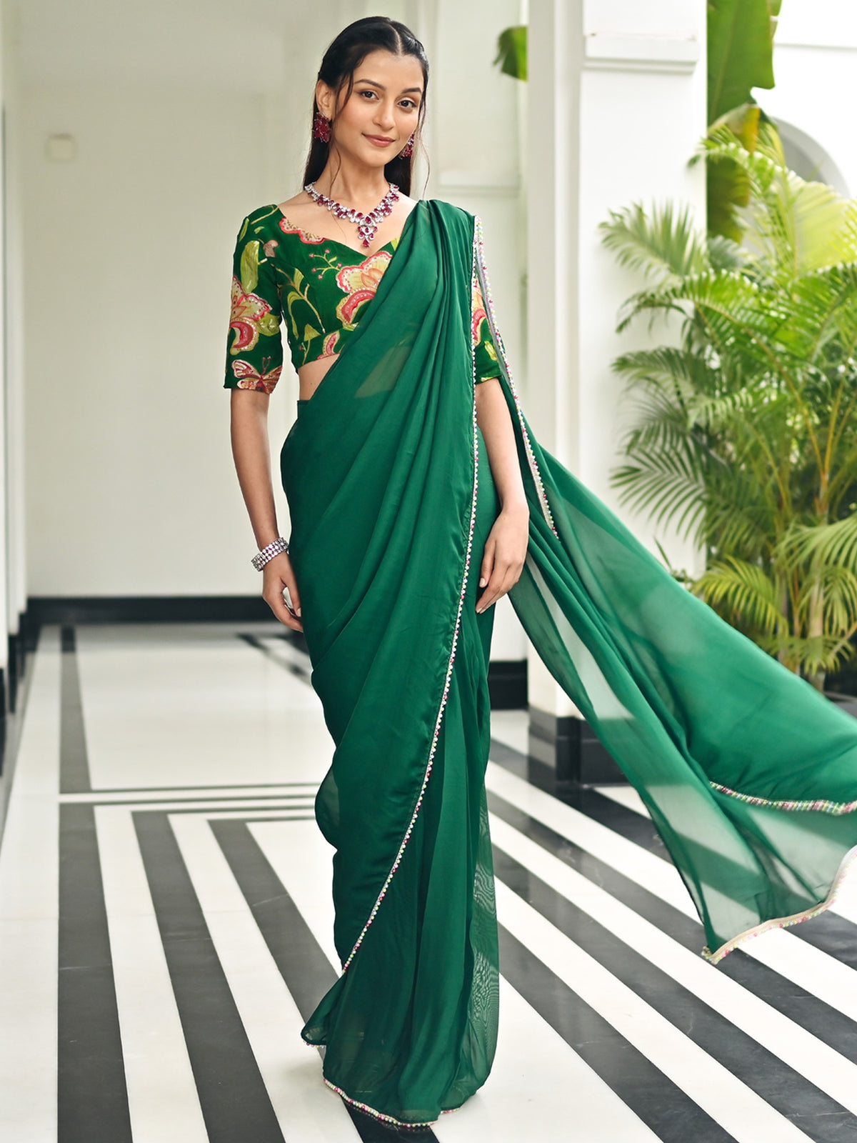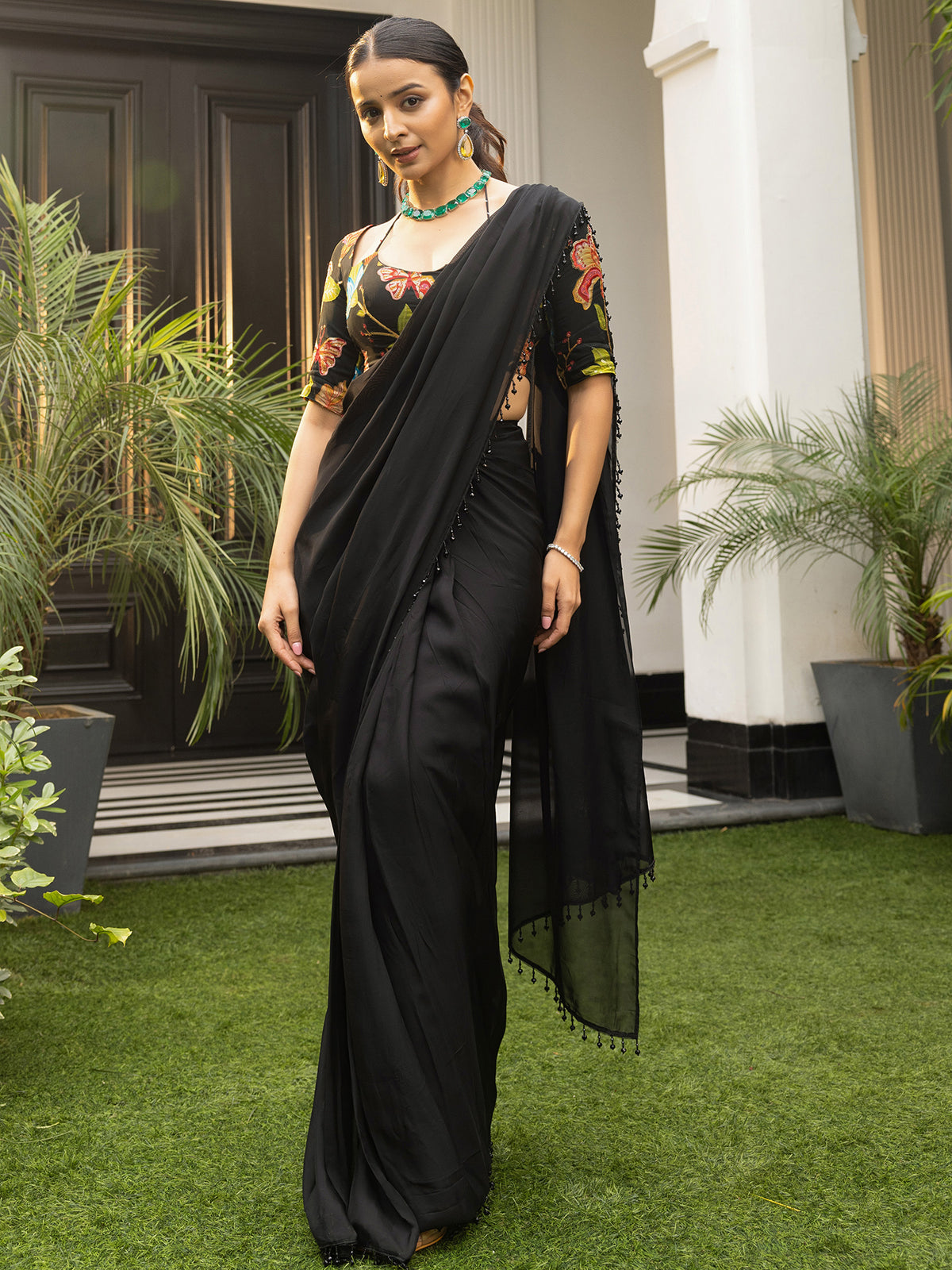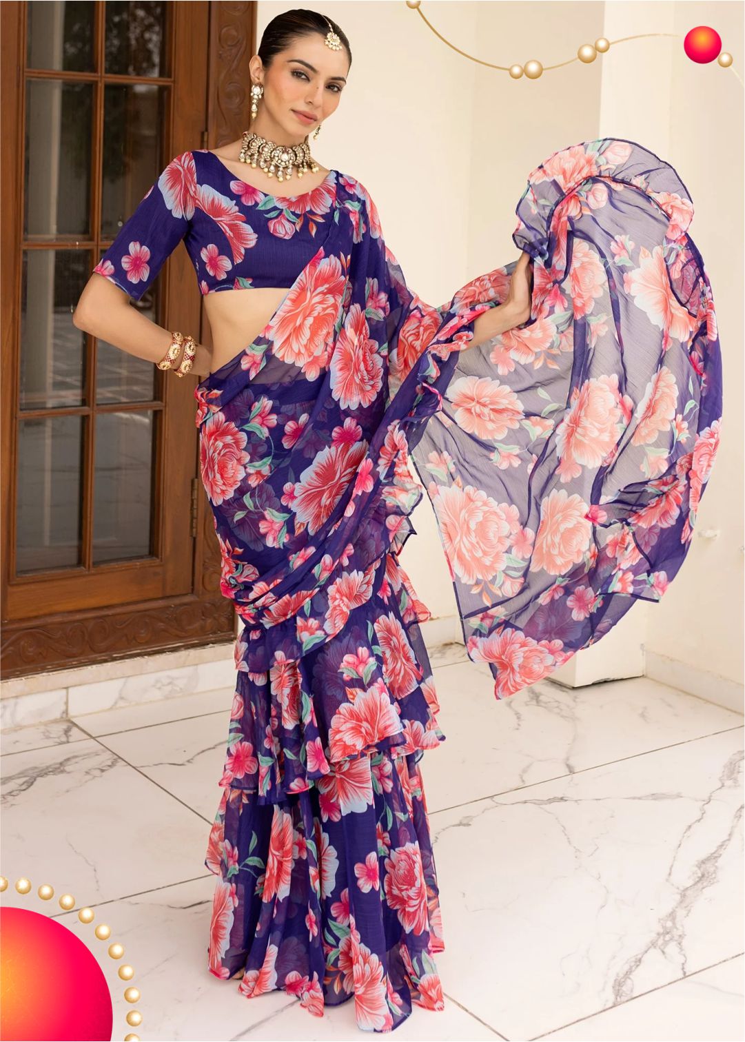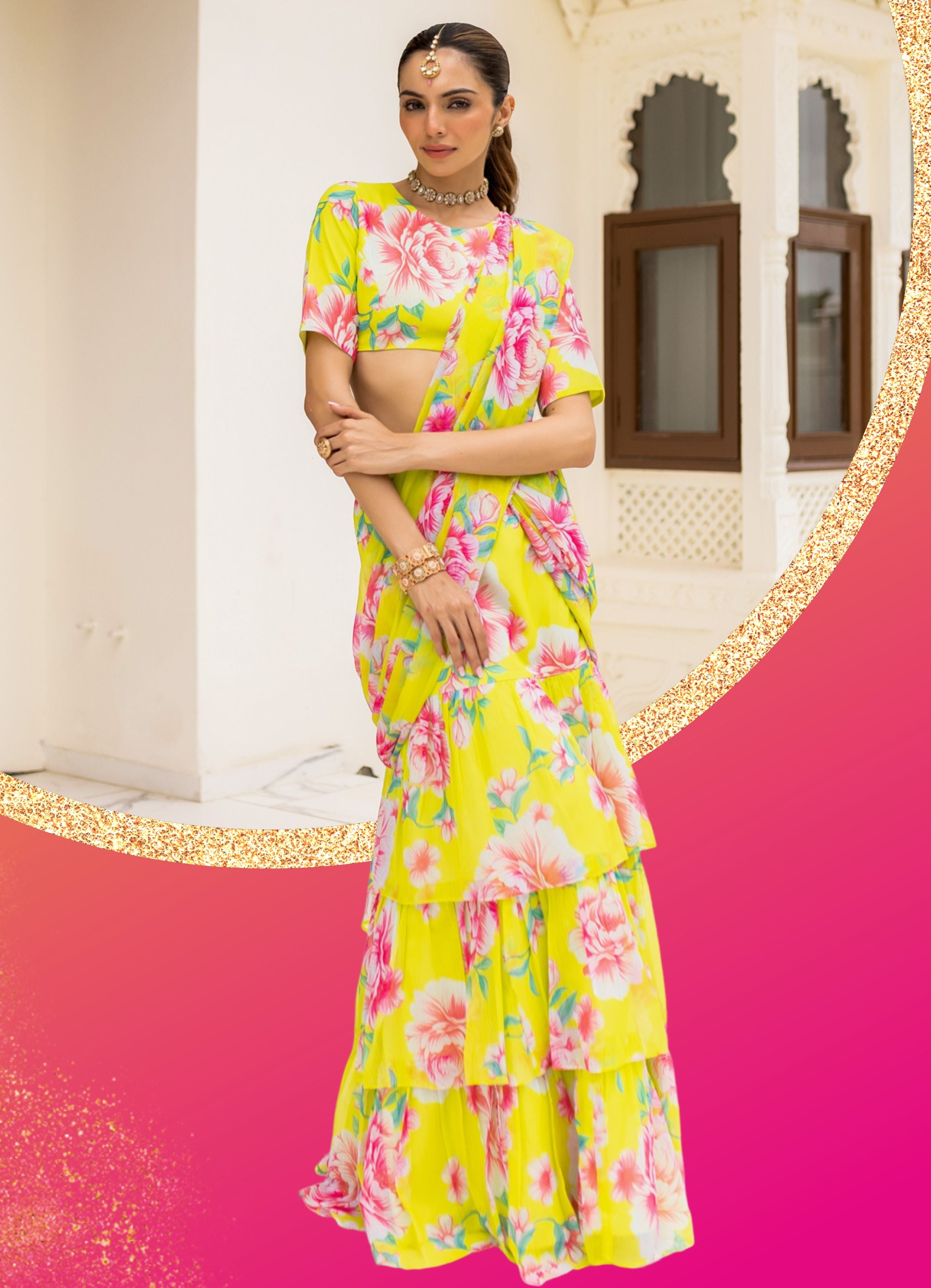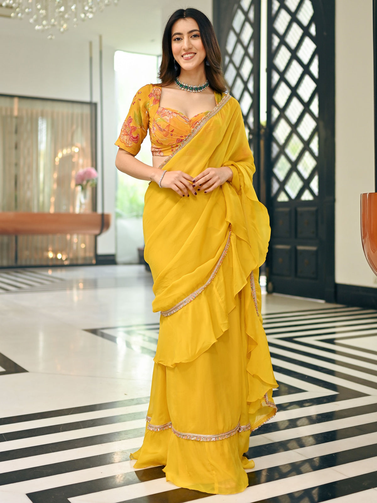 We present you timeless styles in sarees crafted in a wide range of colors, silhouettes, prints, and patterns. Our fabrics blend grace and sophistication in a perfect style. You can wear our sarees to weddings, social gathering, festivals, evening party, or special events. We offer different styles in sarees: ruffled, pleated, draped, ready to wear, sharara, and pre-draped. Browse our designer sarees collection and buy your favorite one.