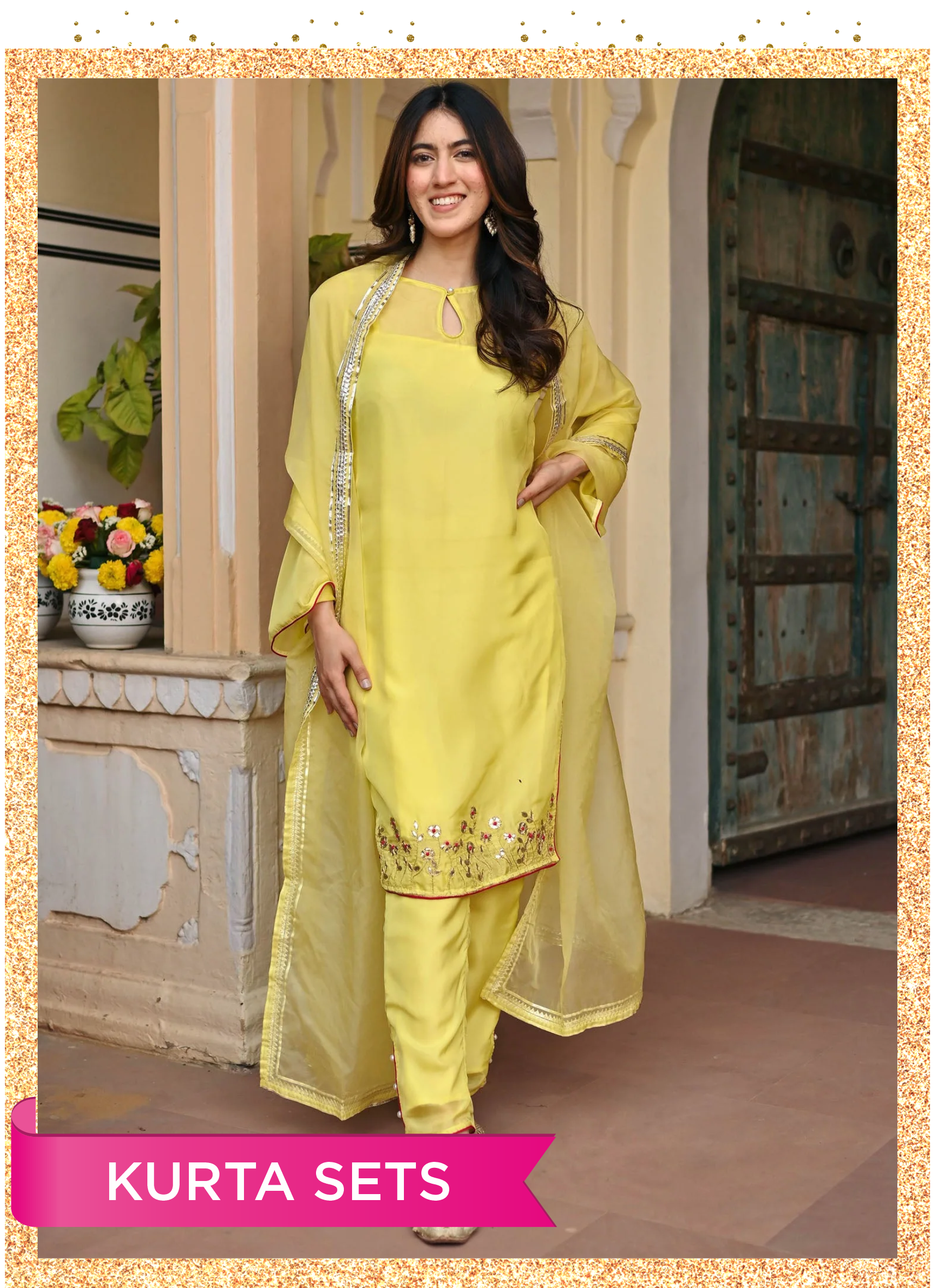 Indian ethnic wear for women is just incomplete without kurta sets. Our kurta sets are available in different silhouettes, designs, hues, cuts, necklines, embroidery, embellishments, and adornments. Be it your routine life, special occasions, events, or festivities, out kurta sets bring out the true ethnic elegance and grace. We have a wide selection of kurtas that includes straight kurta set, kurta dhoti set, handpainted suit set, pant style kurta set, embroidered kurta set, kaftan printed set, and lot more. Explore our collection of kurta sets to buy your choice of kurta set at the best price.