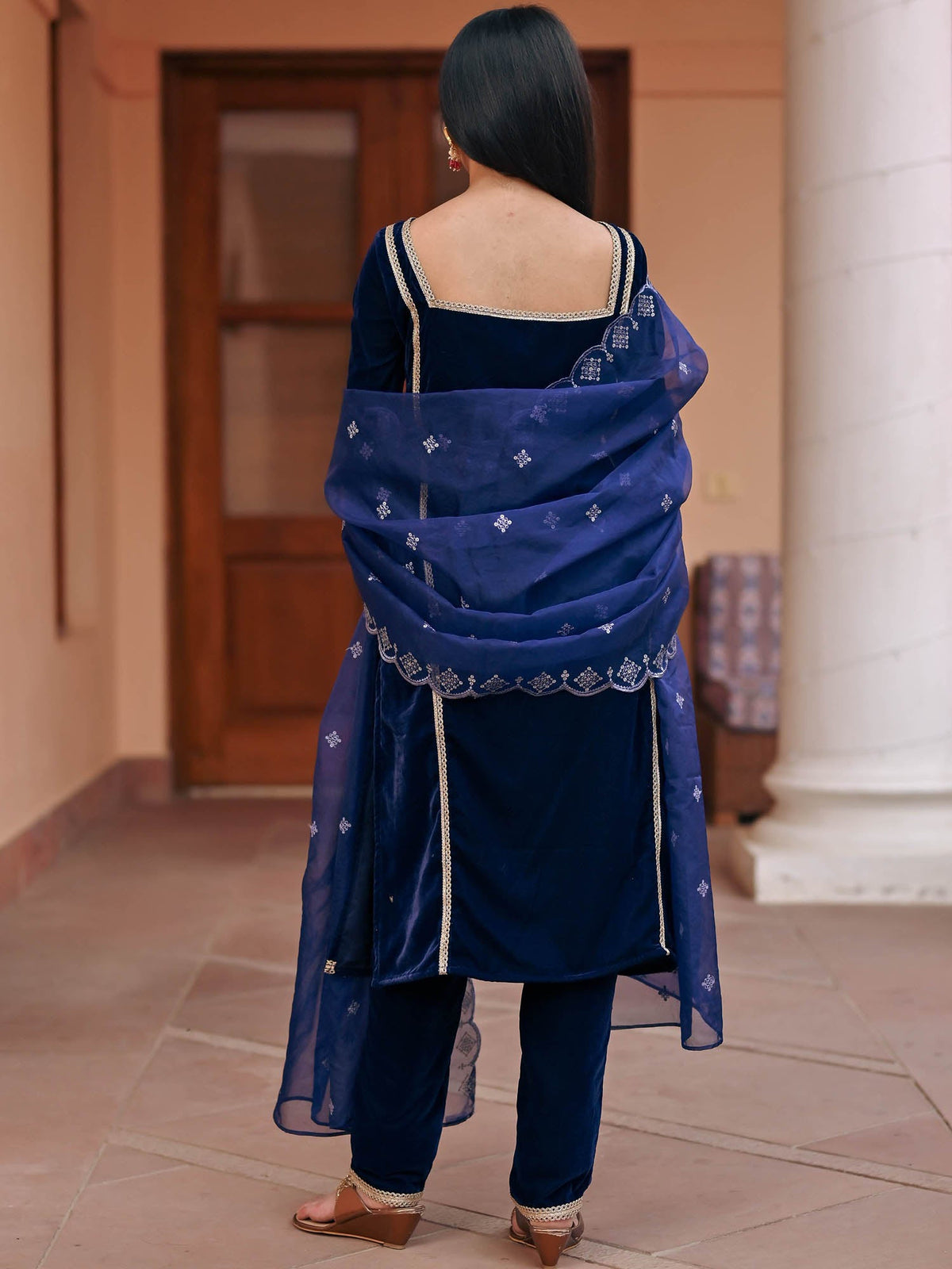 Fabrics like cotton, silk, georgette, organza, velvet, chiffon, blended fabric, chanderi, brocade, and modal are used to make kurta sets.