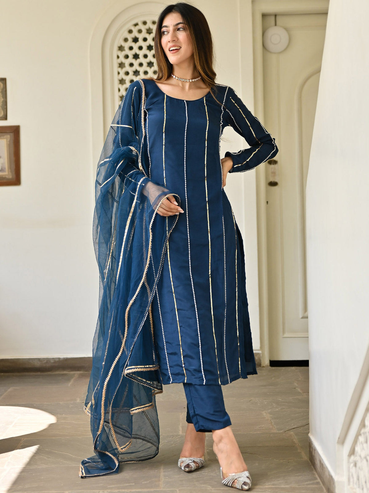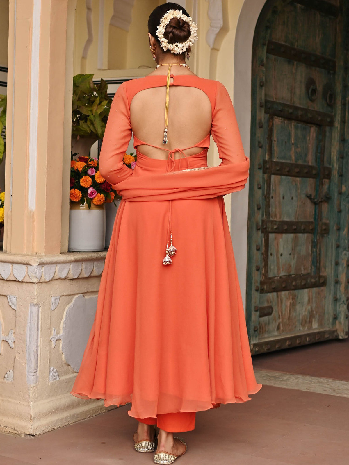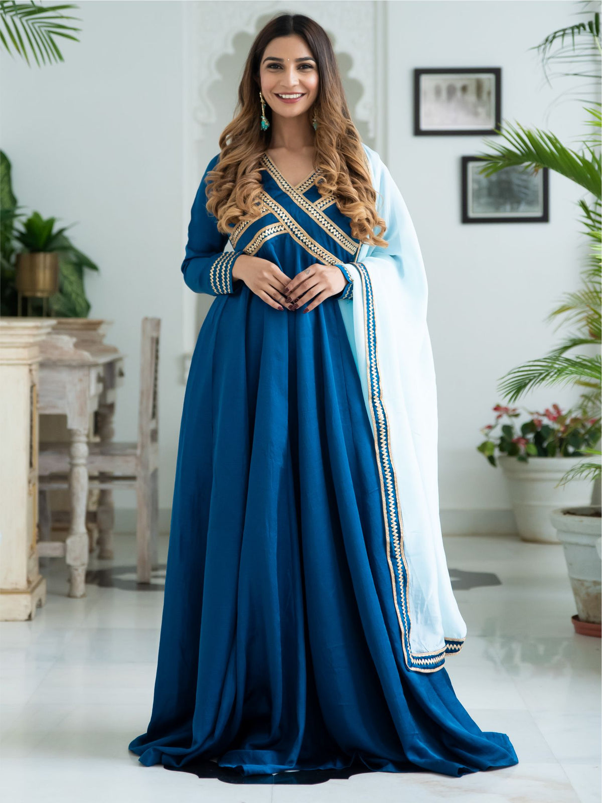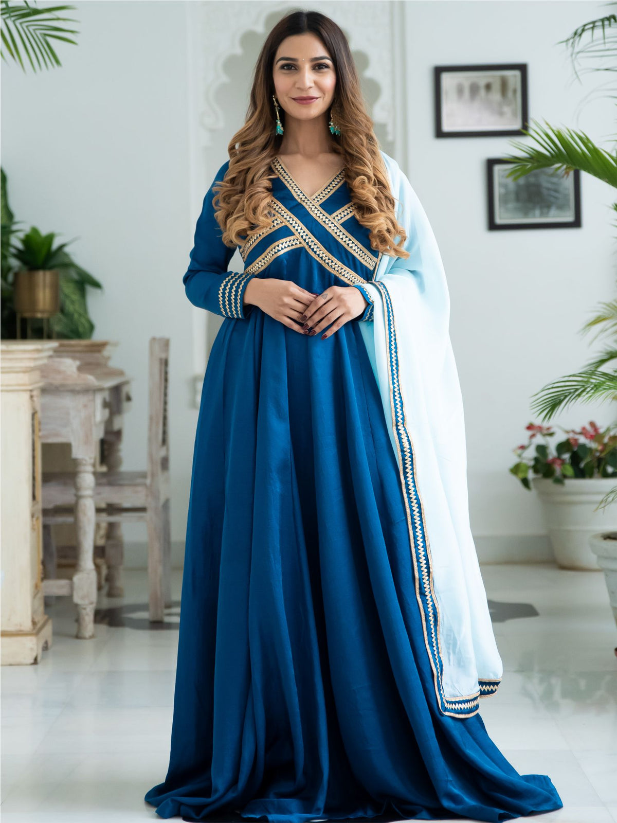 Blue Handwork Georgette Anarkali Set - Popular for its fancy back pattern, this Navratri outfit adds a hint of a contemporary feel to your look. The flowing Anarkali suit style and the marine blue color are perfect for the said occasion.