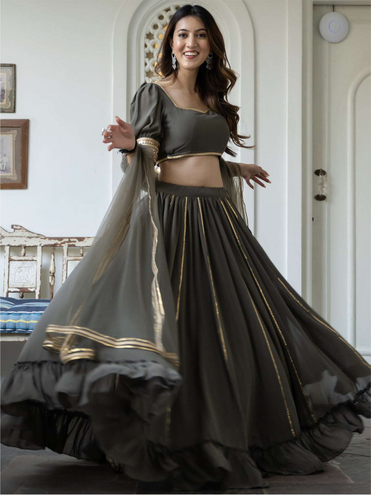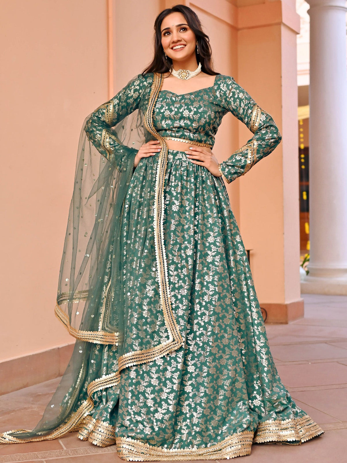Green Jacquard Lehenga Set - The list of Navratri dresses is incomplete without a lehenga set. This heavily embellished lehenga set is sure to make you look like a queen. Its fascinating allure ensures that you look gorgeous, without compromising comfort.