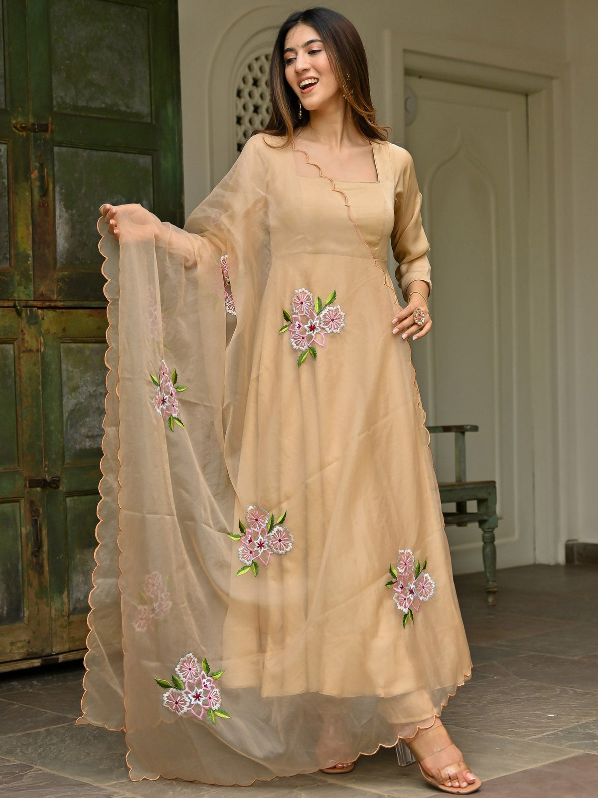 Pink Chiffon Handwork Gown - On one of the days, you can experiment with fashion. Rather than going traditional, you can opt for something trendy and modern. This is one of the Navratri outfits that features the handwork technique. The flare and the pattern of this gown give the wearer a chic look.