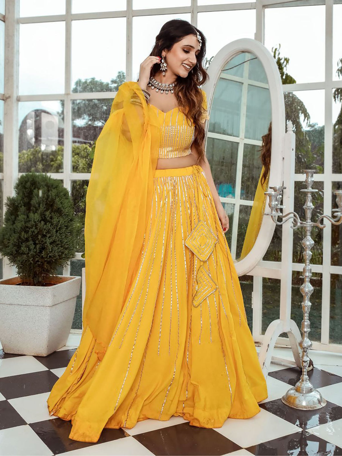 Yellow Mirror Sharara Set - The mirror work adds a charming beauty to this outfit. Perfect for the Dandiya and Garba, this dress ensures comfort and provides you with exceptional style. The peplum-style top twirls with each Garba move, making you look amazing.