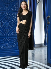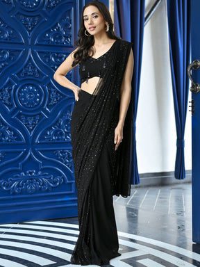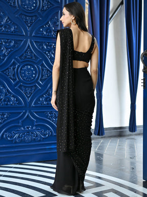 The black georgette blouse with stud embellishments paired with a georgette and mukaish pre-draped saree is an elegant and sophisticated combination. The mukaish fabric's intricate work adds a touch of luxury and enhances the overall look of the saree, making it perfect for a glamorous occasion. The stud embellishments on the blouse complement the saree's sparkle, creating a cohesive and eye-catching ensemble.