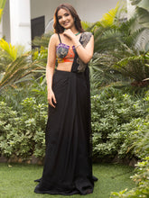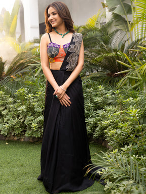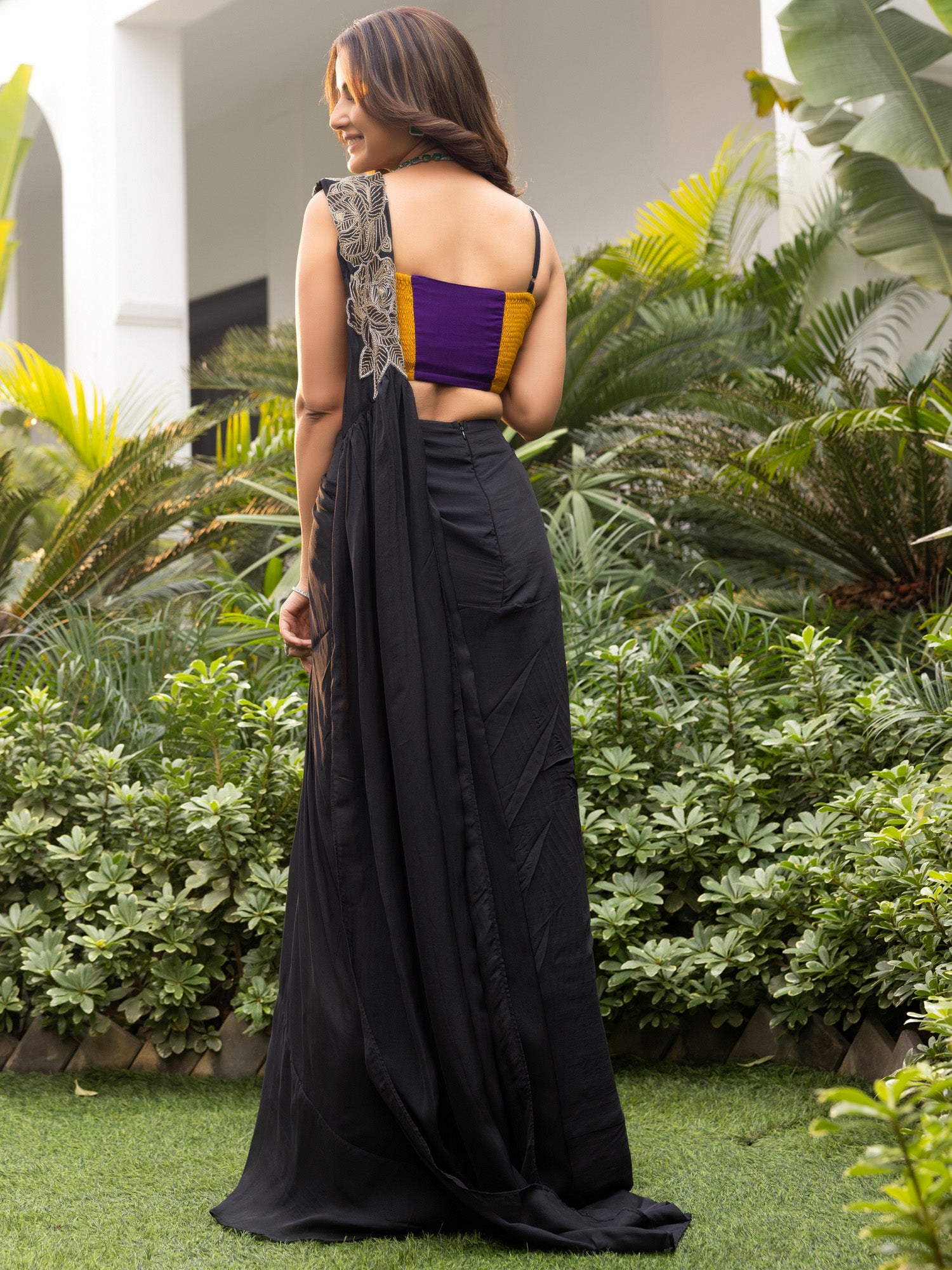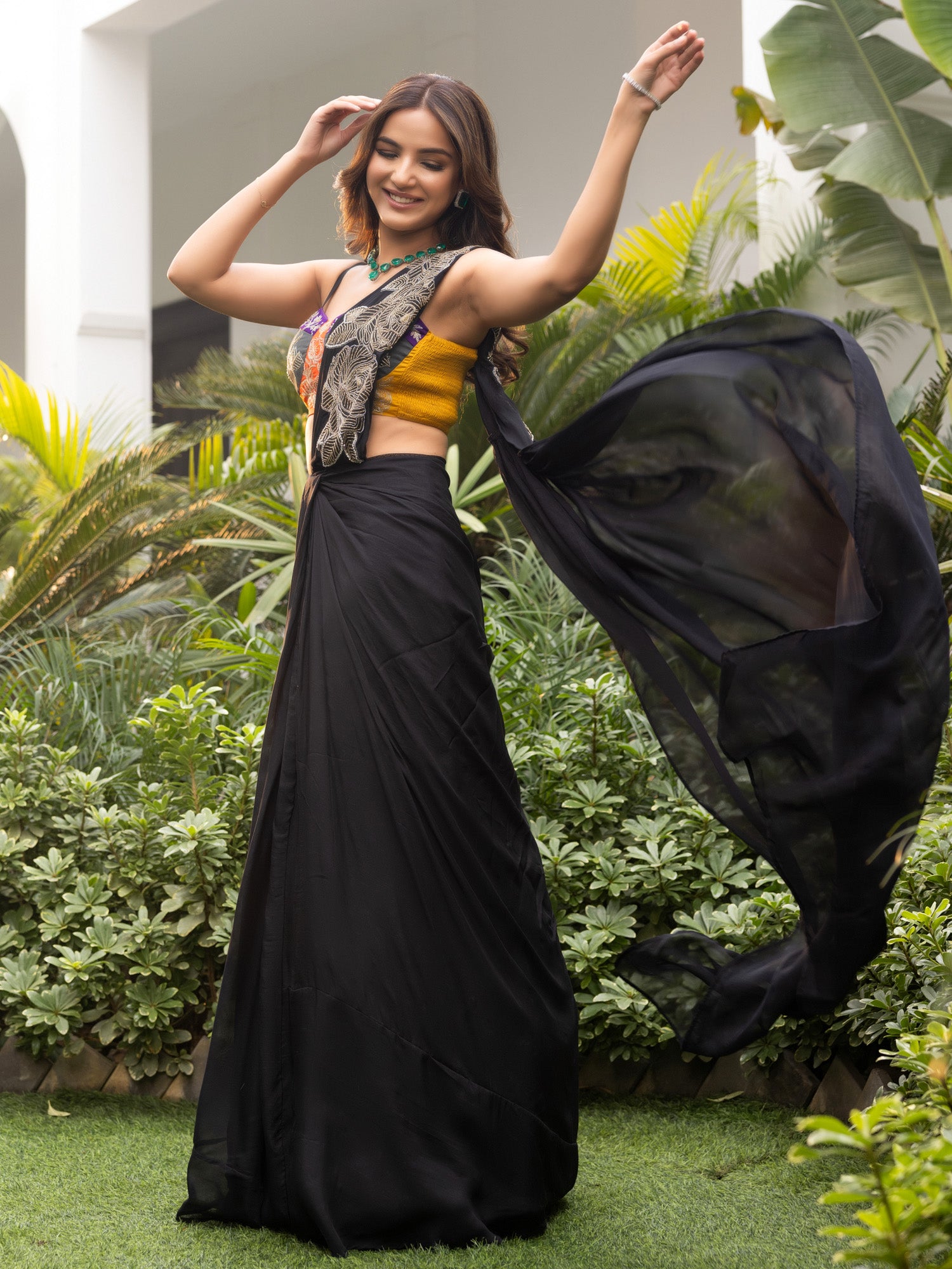 This black organza pre-draped saree is a stunning blend of classic elegance and contemporary design. The sheer fabric gracefully drapes around the body, while the saree is enhanced with a modern border featuring exquisite rose motifs, embroidered in shimmering gold and silver. The contrast blouse, designed in four vibrant colors, complements the saree beautifully and is tailored with a smocked back to ensure a perfect, flattering fit. The blouse is further adorned with intricate gold and silver embroidery, featuring delicate floral motifs that add depth and elegance to the entire look. This ensemble effortlessly balances traditional charm with modern sophistication, making it an ideal choice for a chic and refined occasion.