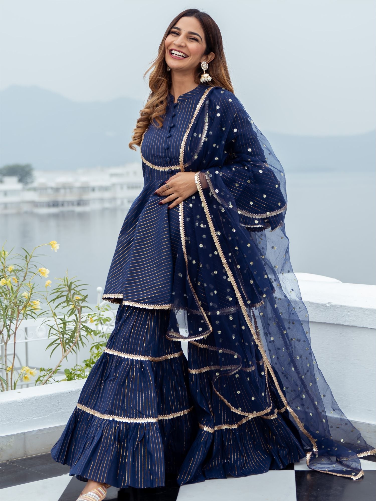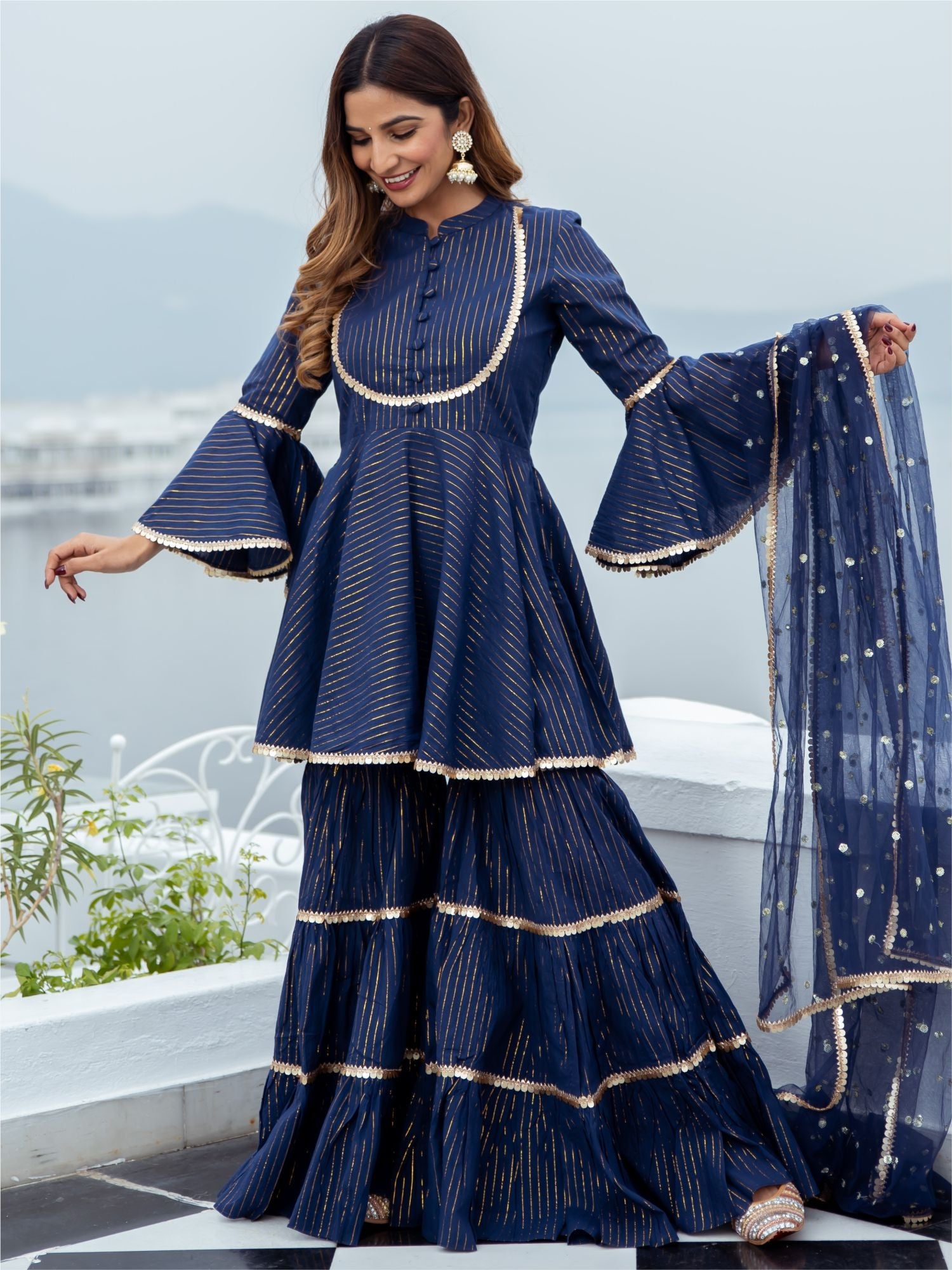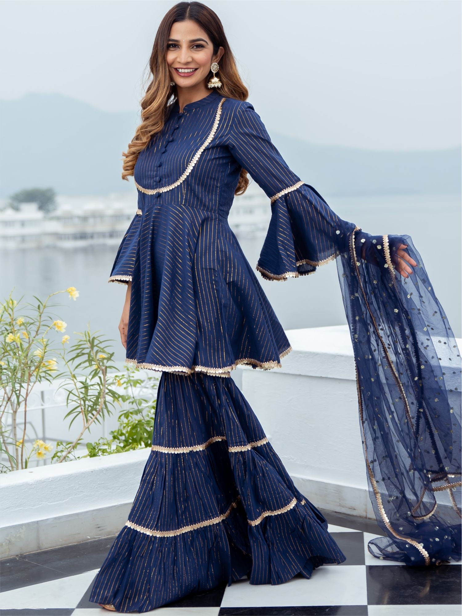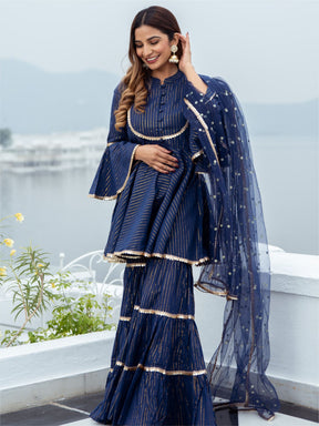 Blue Cotton Lurex Peplum and Sharara Set