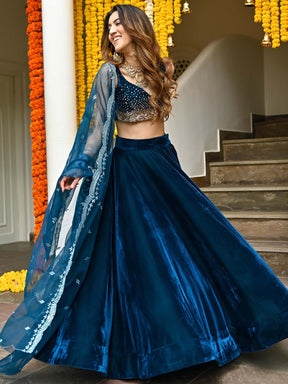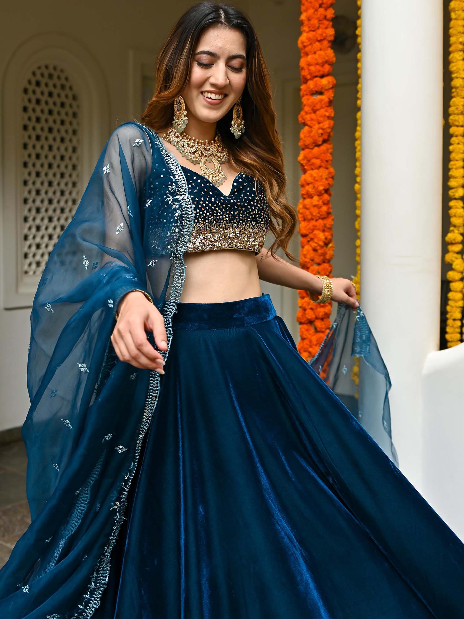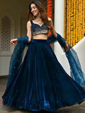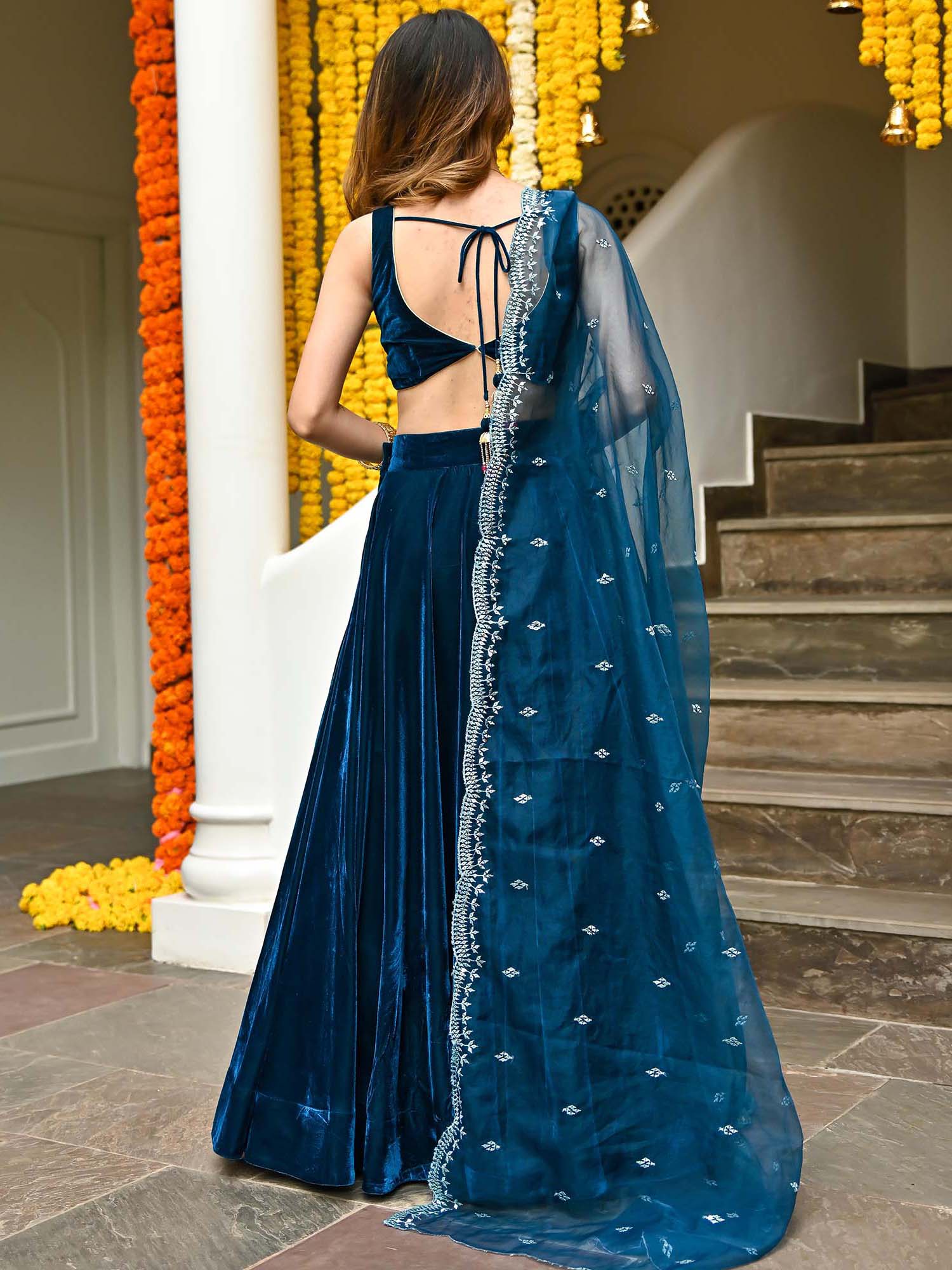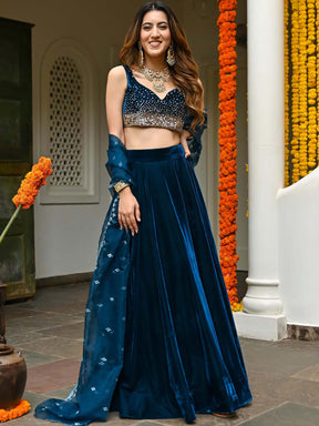 Indulge in the allure of our Blue Velvet Lehenga Set, a mesmerizing ensemble that seamlessly blends sophistication with contemporary elegance. Crafted from luxurious velvet, the deep blue hue exudes regal charm, while intricate embellishments and fine detailing add a touch of opulence. This ensemble is a celebration of timeless style and modern grace, making it the perfect choice for those who seek a stunning, unforgettable look.