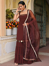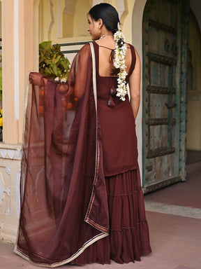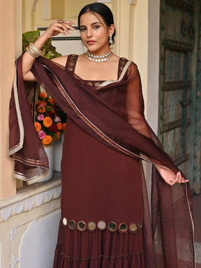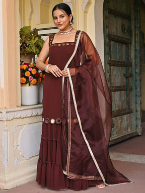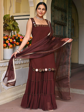 A brown mirror sharara set sounds stunning and unique! Sharara sets typically consist of a flared top paired with wide-legged trousers, and the addition of mirror work adds a touch of ethnic charm and sparkle.