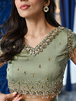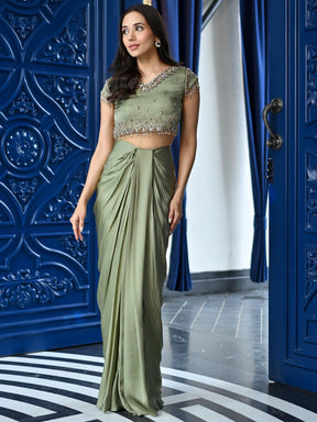 This sophisticated sage green drape set is a perfect blend of elegance and charm, ideal for the festive and wedding season. The top features intricate crystal handwork, adding a touch of sparkle and refinement, while the short sleeves keep it stylishly contemporary. The draped silhouette flows gracefully, offering both comfort and glamour, making it an ideal choice for celebrations. With its soft sage green hue and shimmering accents, this ensemble embodies understated luxury, making it a versatile yet standout addition to any festive wardrobe.