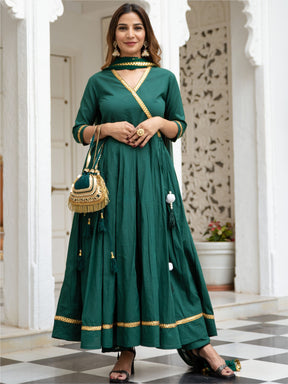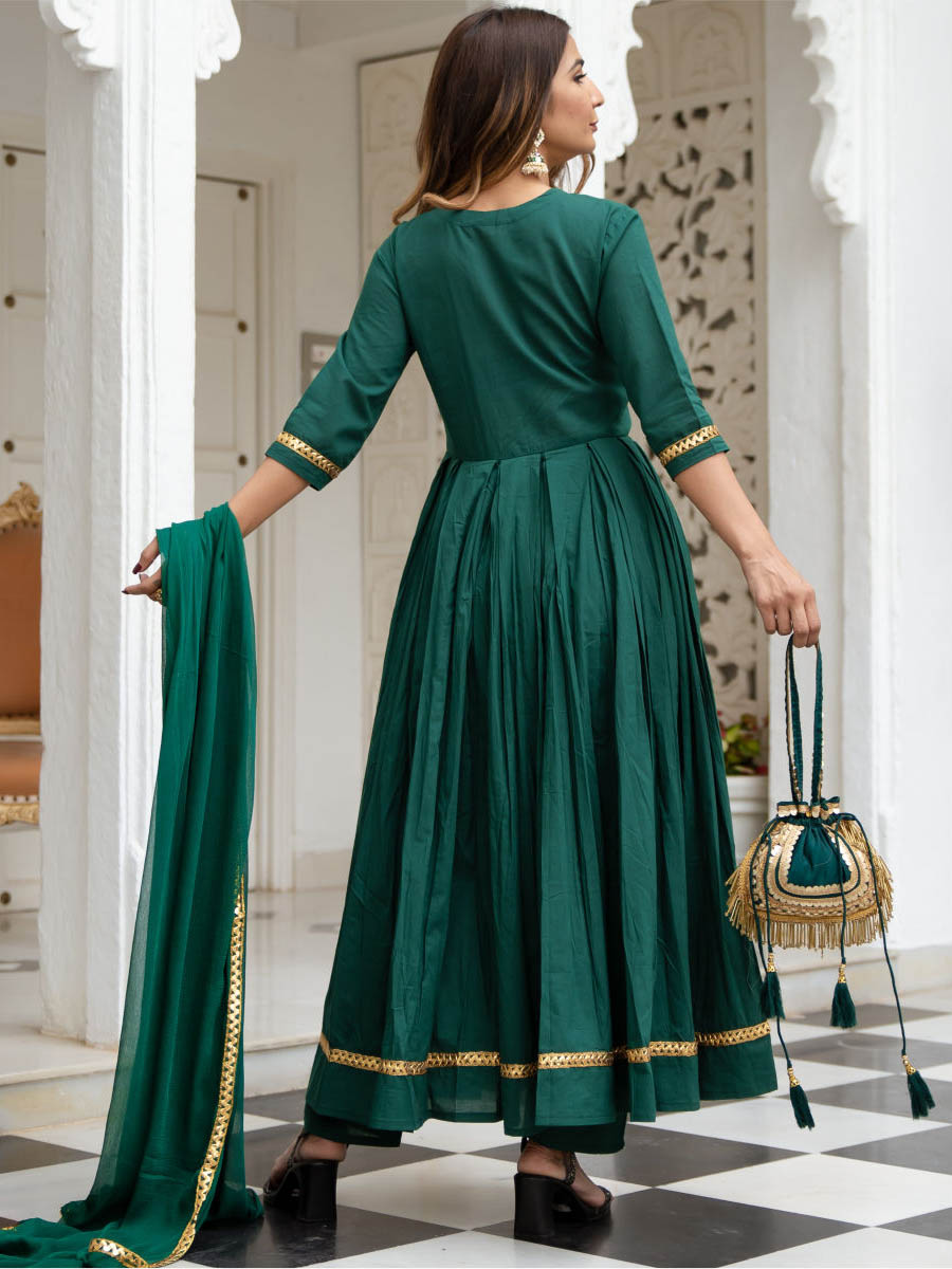 Elevate your style with our Dark Green Cotton Flared Kurta and Pant Set. This captivating ensemble seamlessly blends comfort and sophistication, featuring a gracefully flared kurta paired with coordinating pants. The rich dark green hue adds a touch of elegance, making it the perfect choice for any occasion.