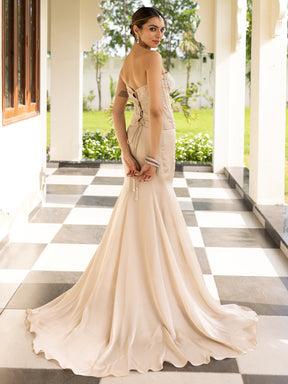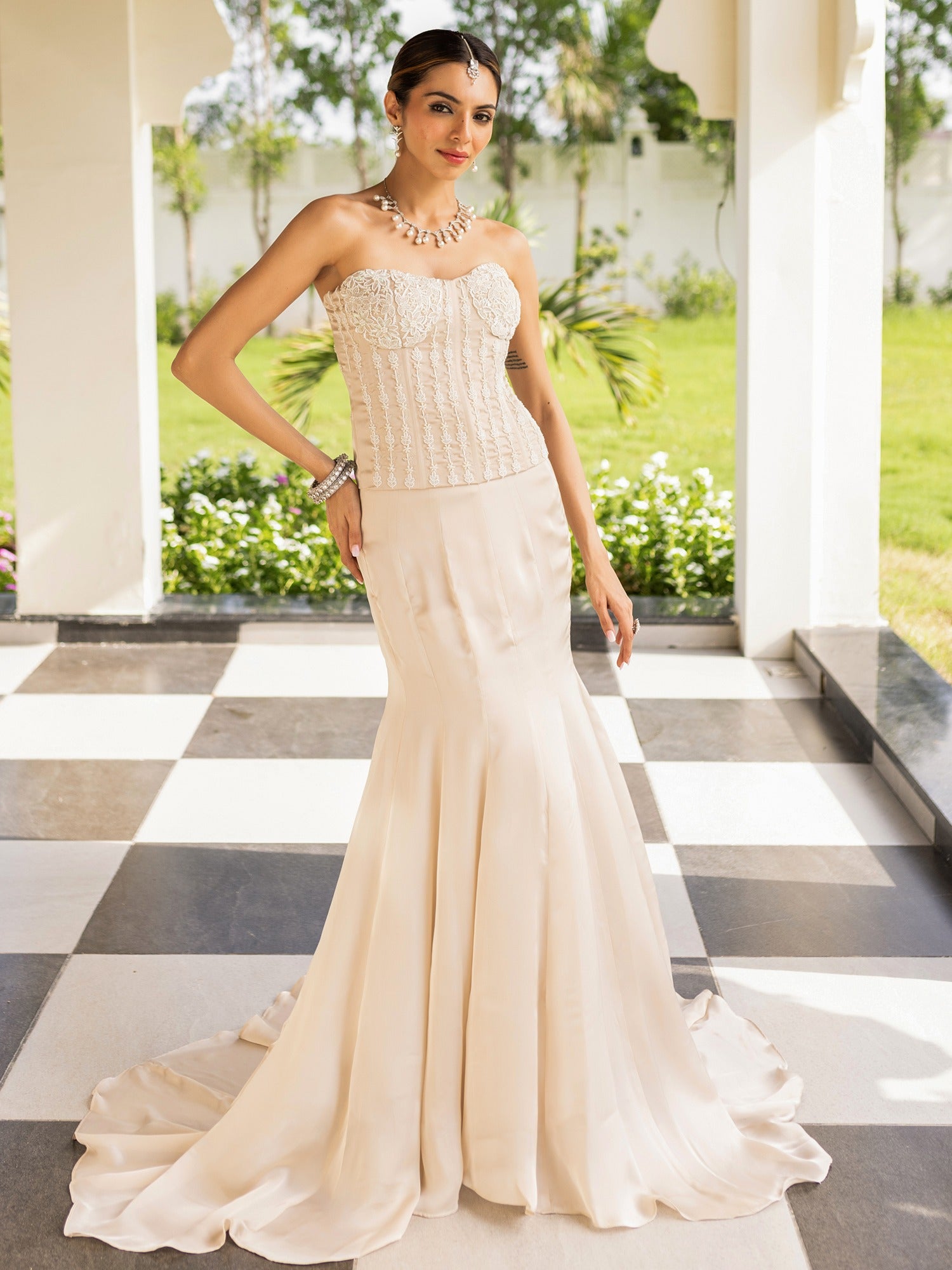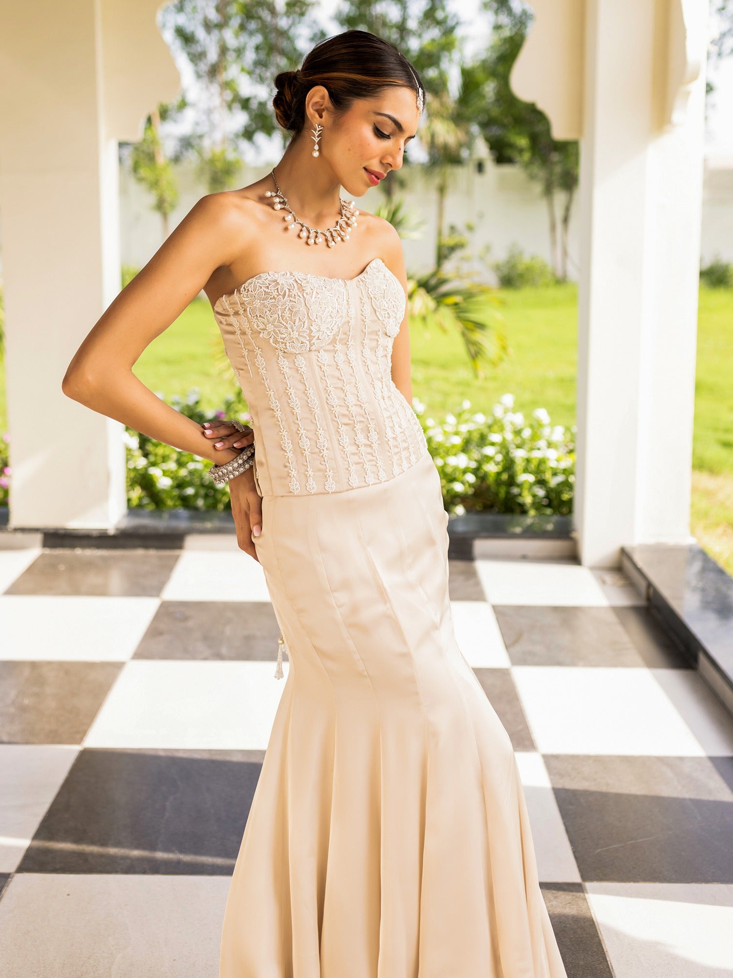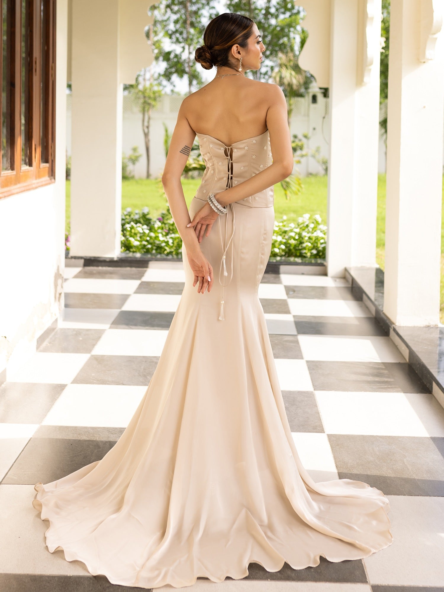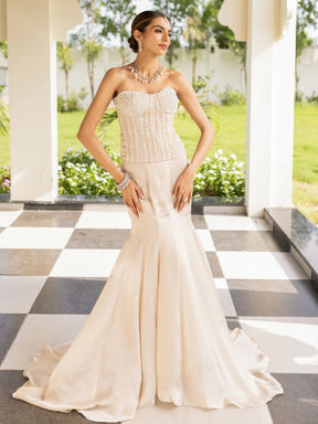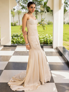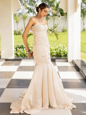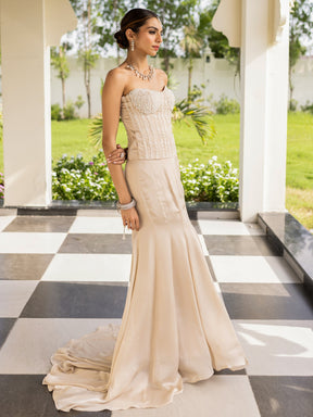 A dreamy corset top paired with a draped skirt featuring an elegant, extended tail at the back creates a silhouette that’s both timeless and modern. The structured corset cinches the waist beautifully, enhancing the feminine form, while the flowing drape adds movement and grace. Intricate handwork of modern floral motifs, delicately embellished with beads and moti, elevates the ensemble with a refined touch of glamour. The blend of traditional craftsmanship and contemporary design makes this look effortlessly classy and chic—perfect for any occasion where sophistication and style are key