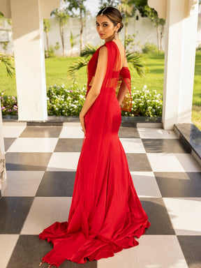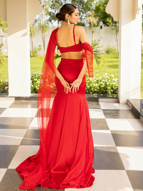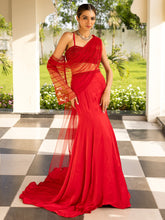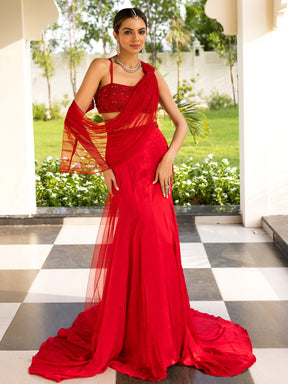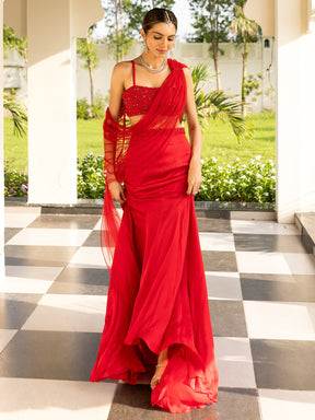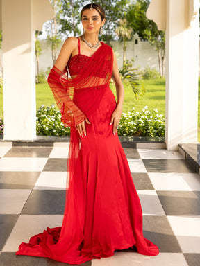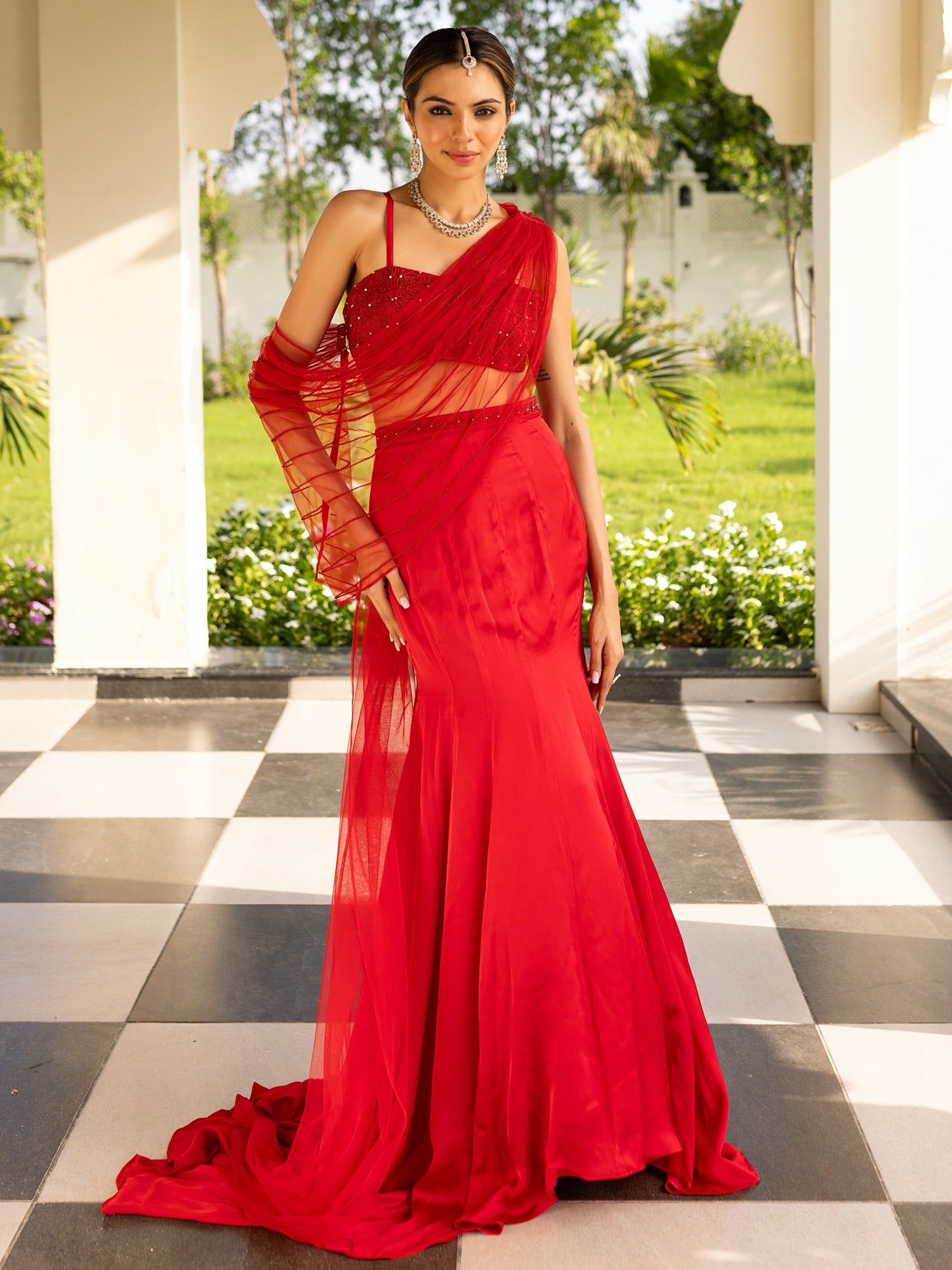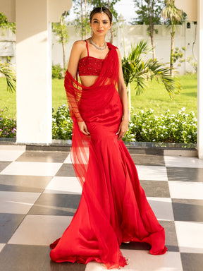 A dreamy tube drape top paired with a draped skirt featuring an elegant, extended tail at the back creates a silhouette that’s both timeless and modern. The structured corset cinches the waist beautifully, enhancing the feminine form, while the flowing drape adds movement and grace. Intricate handwork of modern floral motifs, delicately embellished with beads and moti, elevates the ensemble with a refined touch of glamour. The blend of traditional craftsmanship and contemporary design makes this look effortlessly classy and chic—perfect for any occasion where sophistication and style are key