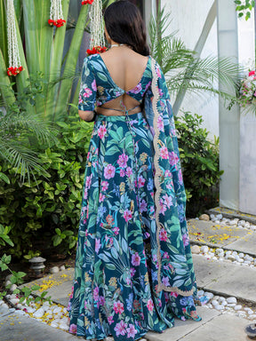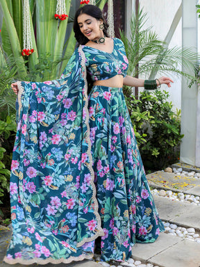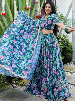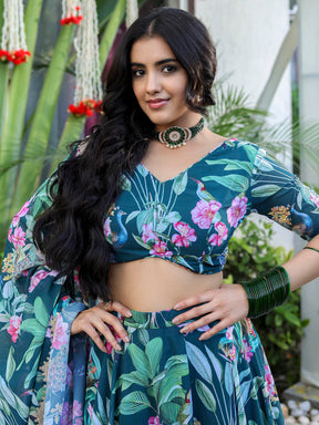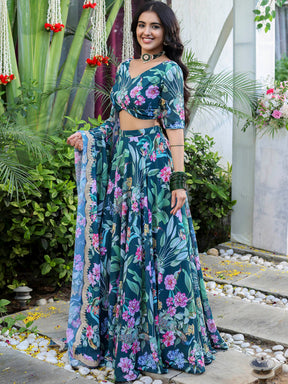Unveil Festive Glamour with our Elbow-Length Green Printed Lehenga Set. It features a graceful V-neck, regular fit, captivating print, and a convenient hook-eye closure for effortless elegance. Rise to the occasion with this high-rise ensemble, celebrating style and tradition