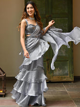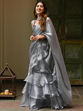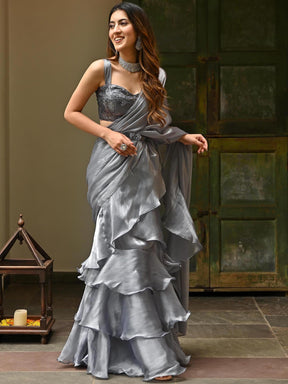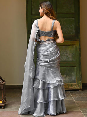 Grey Sequins Organza Ruffle Saree