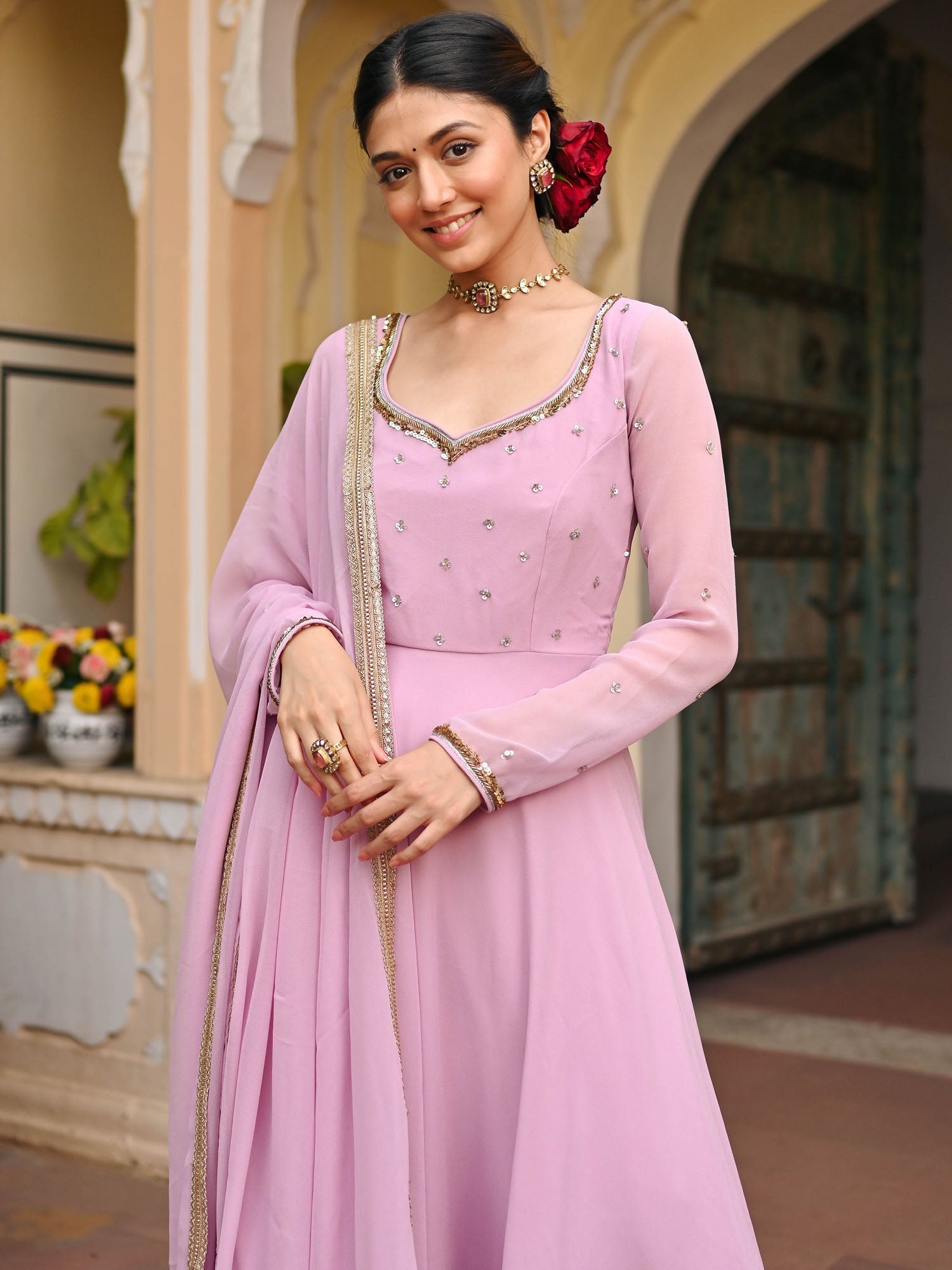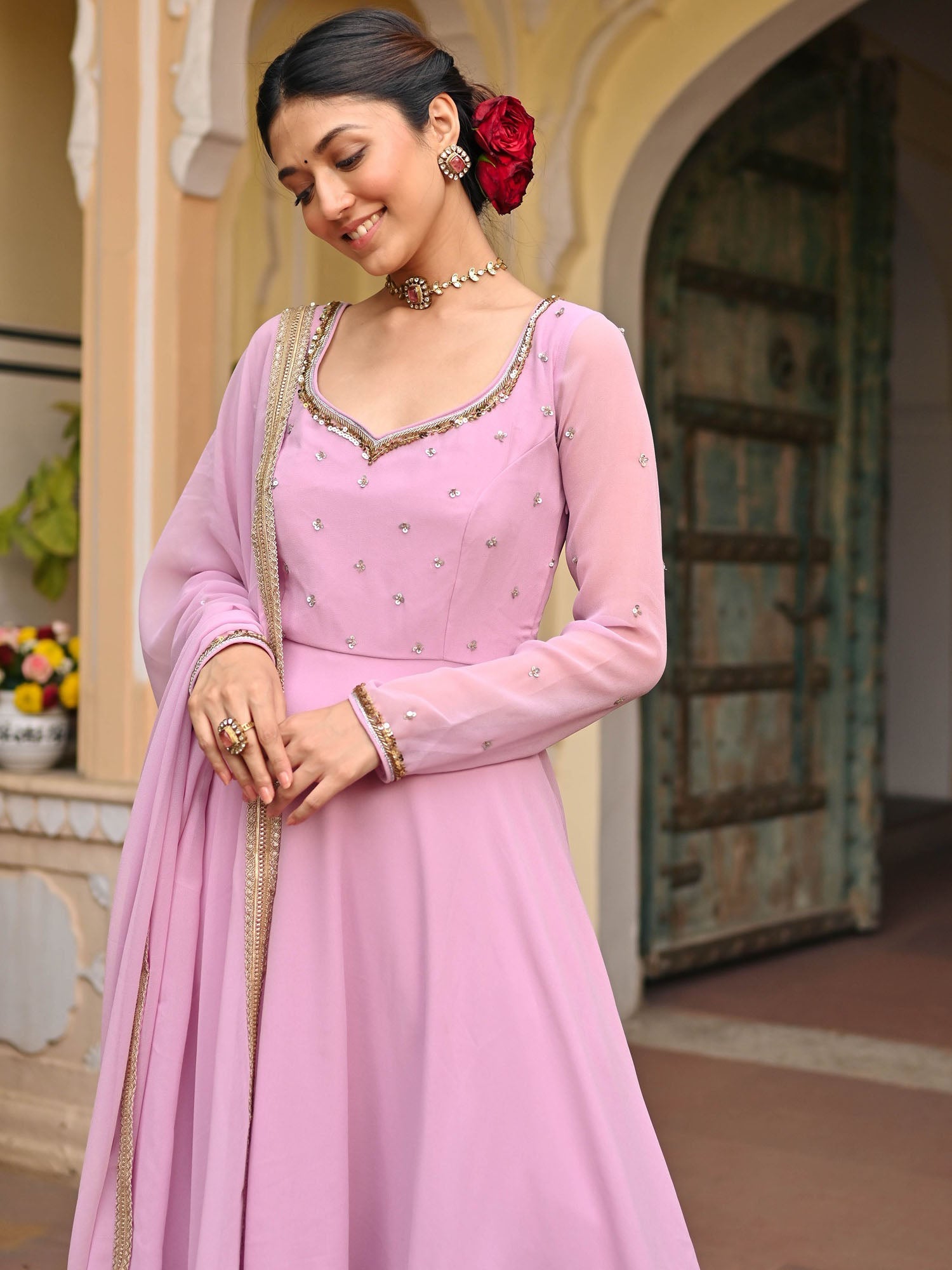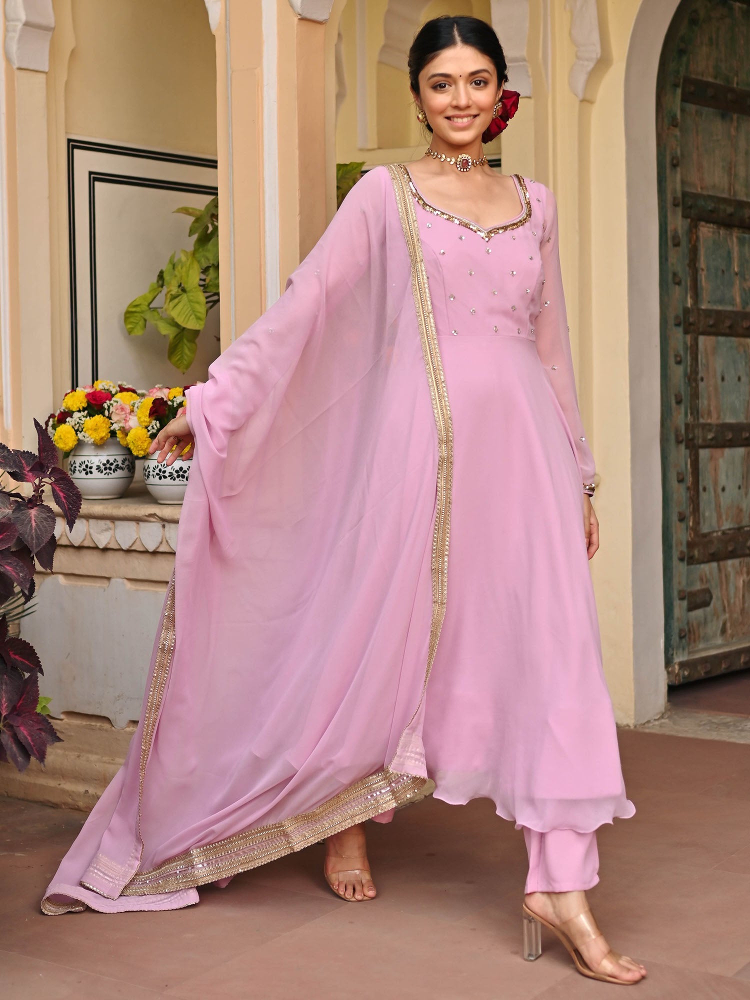 A Lavender georgette handwork Anarkali set would feature a graceful Anarkali-style top crafted from lavender-colored georgette fabric, known for its lightweight and flowing nature.
