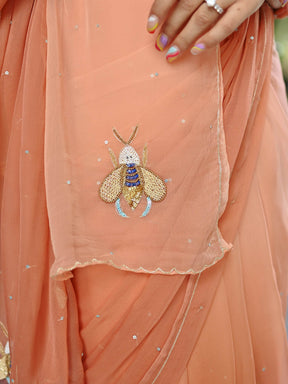 Experience elegance with our exquisite beige chiffon saree, meticulously crafted to elevate your style. This saree features a delicate embellishment of gold sequins, pearls, and cutdana work, adding a luxurious sparkle to the fabric. The design is further enhanced with a charming bee motif, intricately incorporated to make a statement. Zari lines are used to create a structured yet fluid look, perfect for any special occasion."