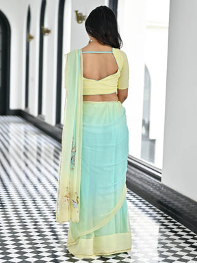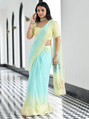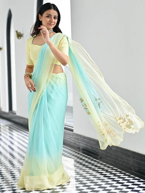 The yellow and blue chiffon saree sounds elegant and eye-catching. The golden sequins and pearl embellishments, especially with butterfly-shaped motifs, will surely add a touch of sophistication and uniqueness to the saree. This design would be perfect for festive occasions or special events, where the vibrant colors and intricate details can truly stand out.
