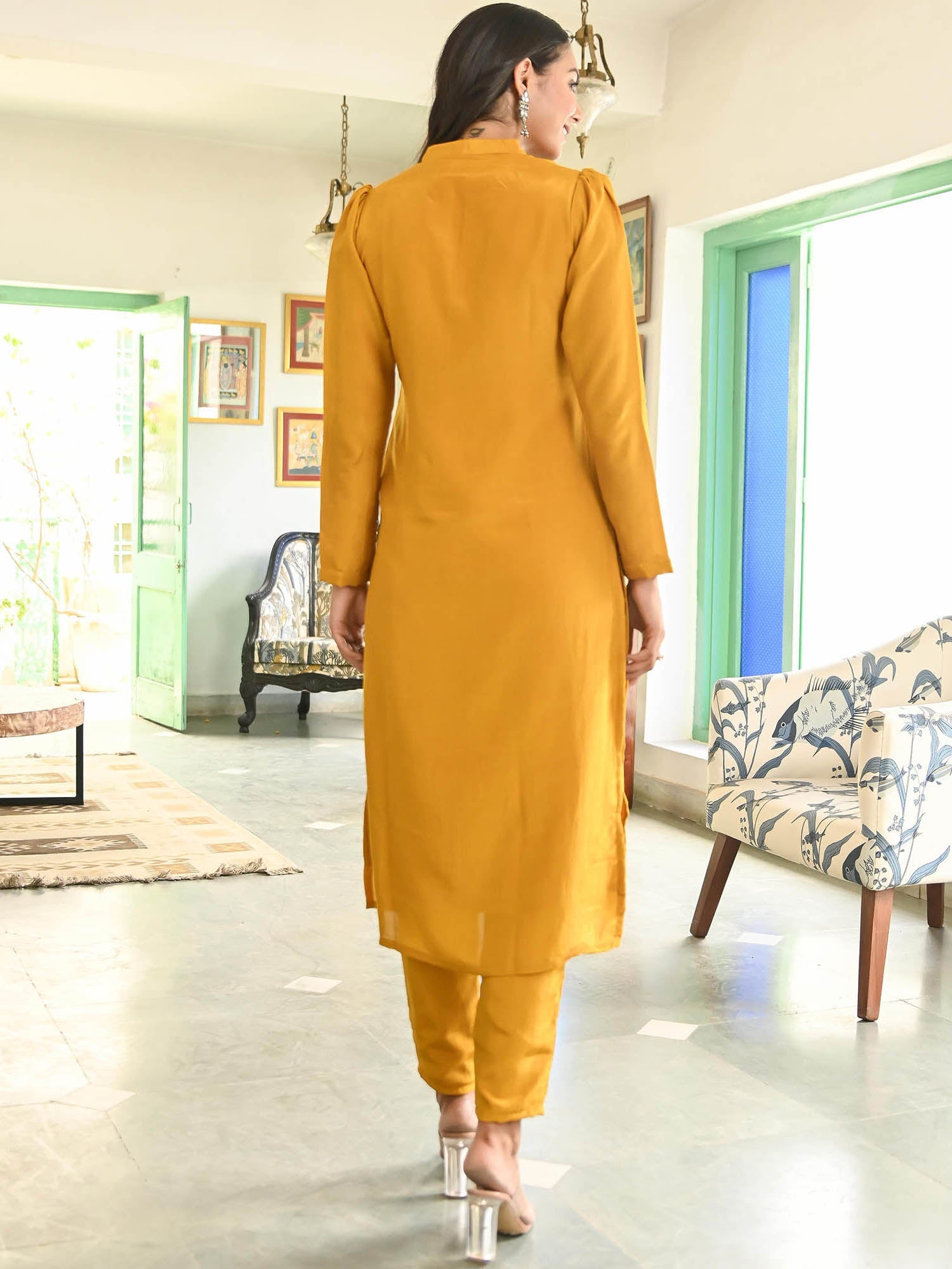 Elevate your style with this Mustard Yellow Silk Straight Kurta Set. Crafted with luxurious silk, the vibrant mustard hue adds a touch of sunshine to your wardrobe. The straight silhouette exudes elegance, making it perfect for both casual and formal occasions. Embrace sophistication and comfort in this effortlessly chic ensemble.