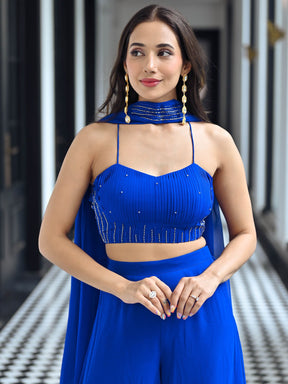 Royal Blue Full-Flared Palazzo with Hand-Embroidered Pleated Blouse"