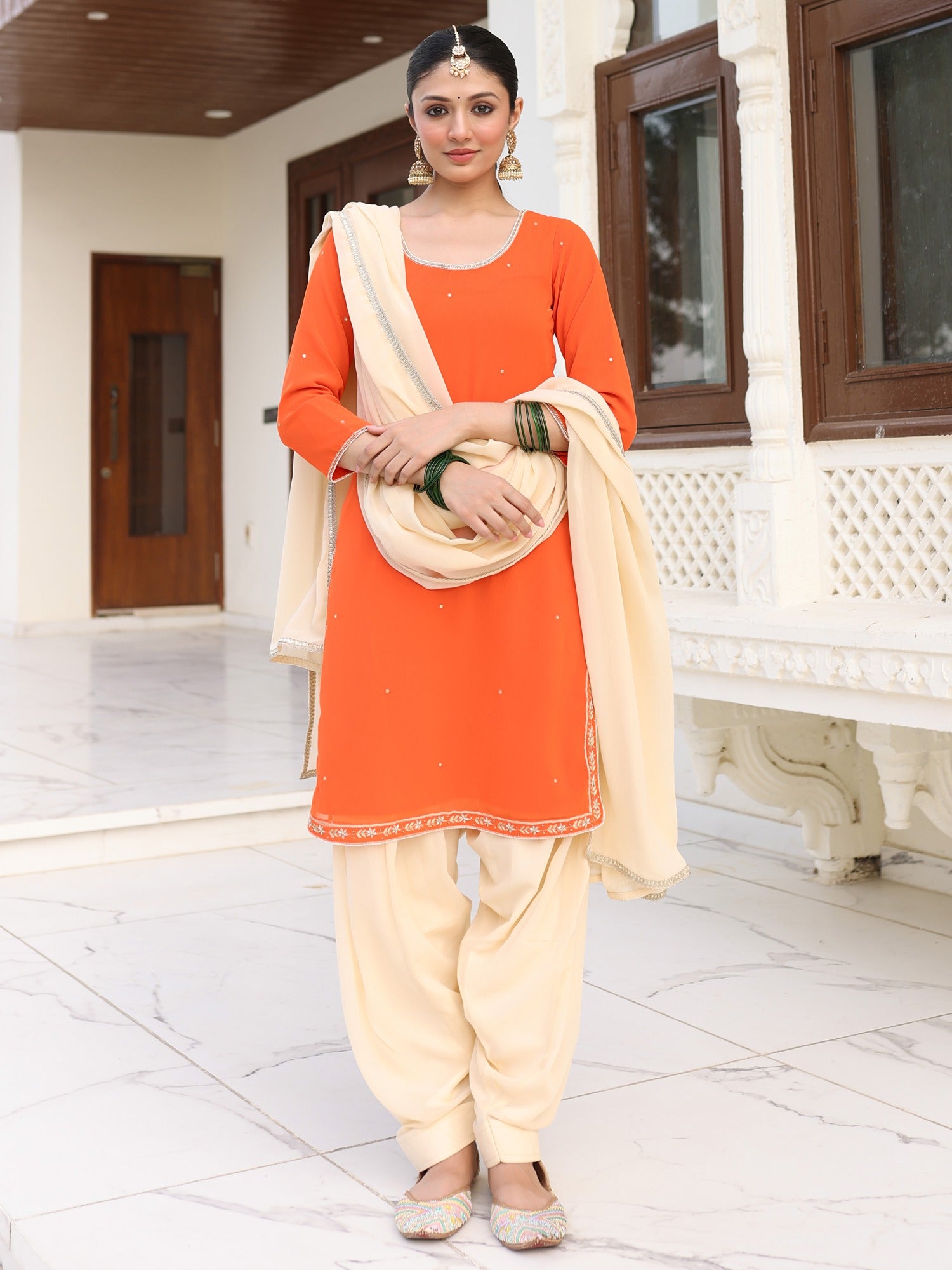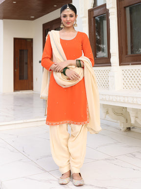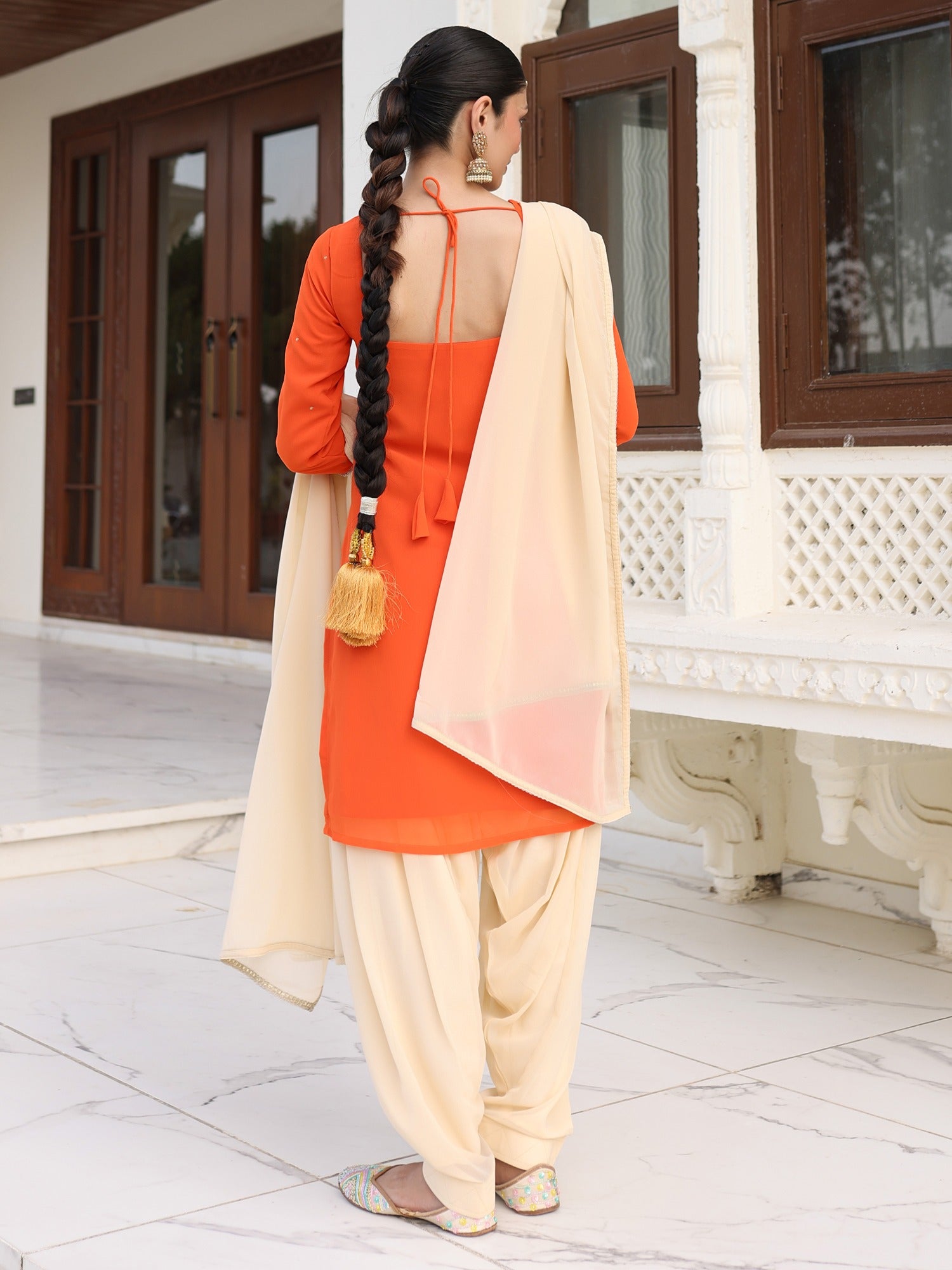 This Georgette Patiala set is a stunning ensemble, designed in a striking Orange & beige contrast of colors that exudes elegance and charm. The orange kurta is beautifully adorned with intricate zari and sequin work in both gold and silver, adding a rich shimmer to the outfit. Delicate pearl handwork enhances the hemline and neckline, lending a touch of grace and sophistication. The Patiala bottoms complement the kurta perfectly, offering a traditional yet stylish look. Completing the ensemble is a flowy dupatta, finished with a gorgeous golden lace border that adds to the overall regal appeal. Ideal for festive occasions or special gatherings, this set effortlessly blends traditional craftsmanship with contemporary flair.