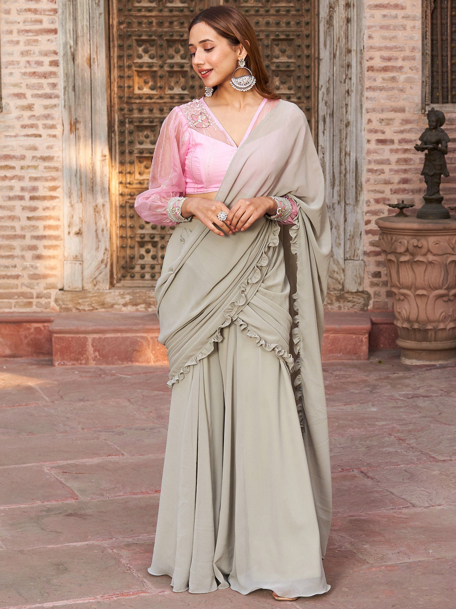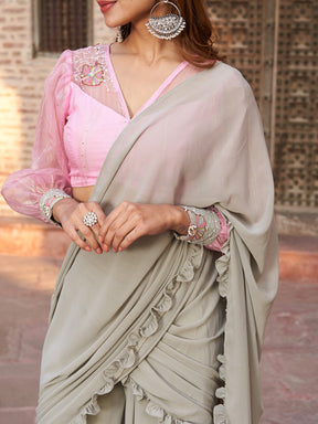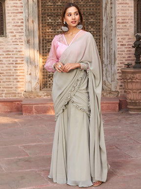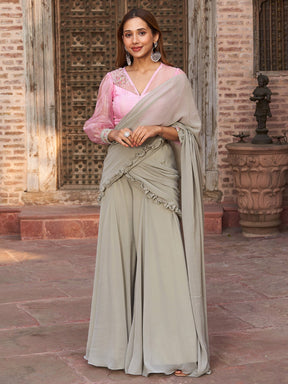 Elegant and captivating, the Pink and Grey Palazzo Saree seamlessly blends tradition with modern flair. The soft pink hue complements the graceful drape, while the subtle grey palazzo pants add a contemporary twist. This ensemble exudes sophistication, making it a perfect choice for those seeking timeless charm with a touch of contemporary allure.