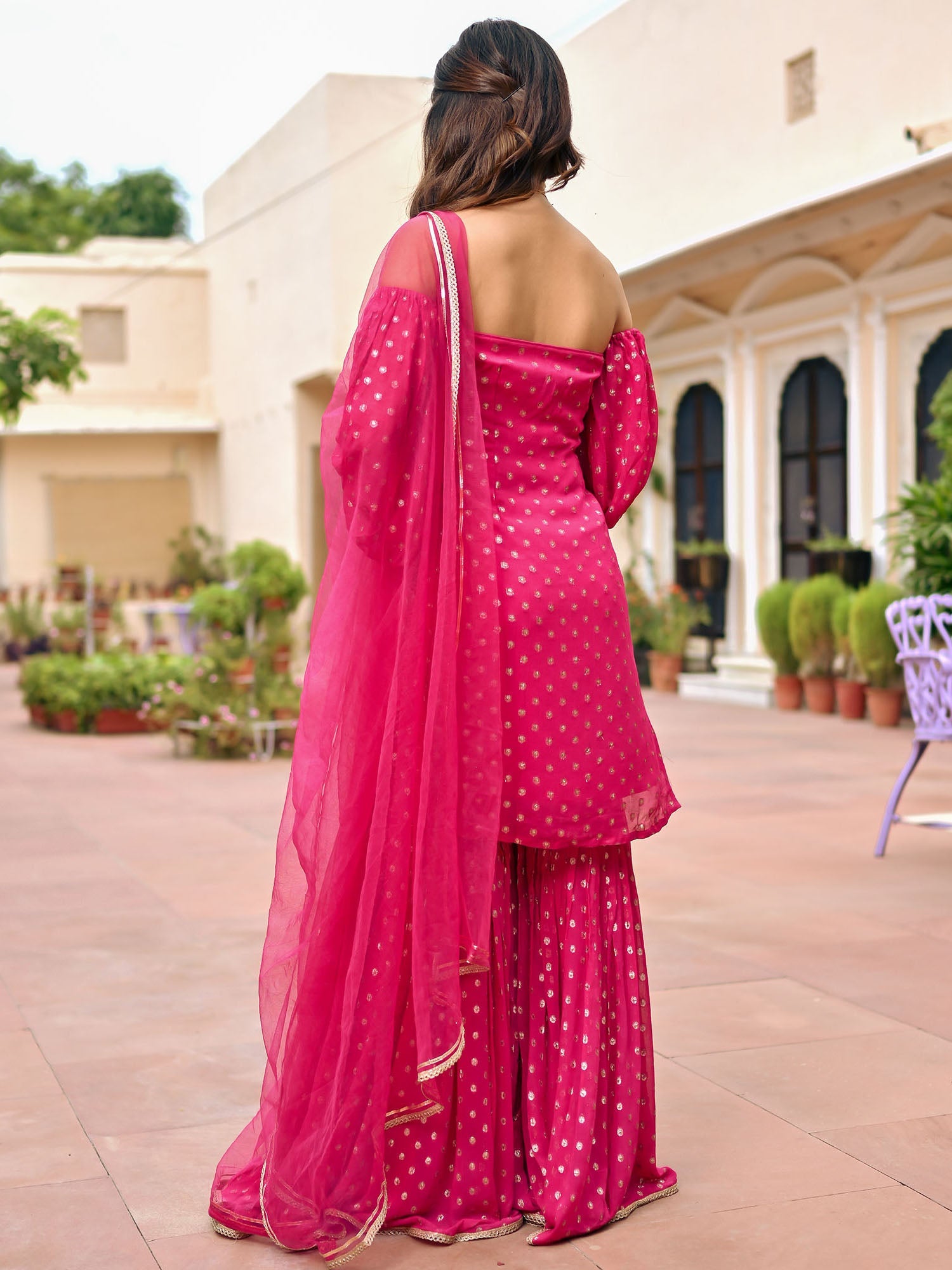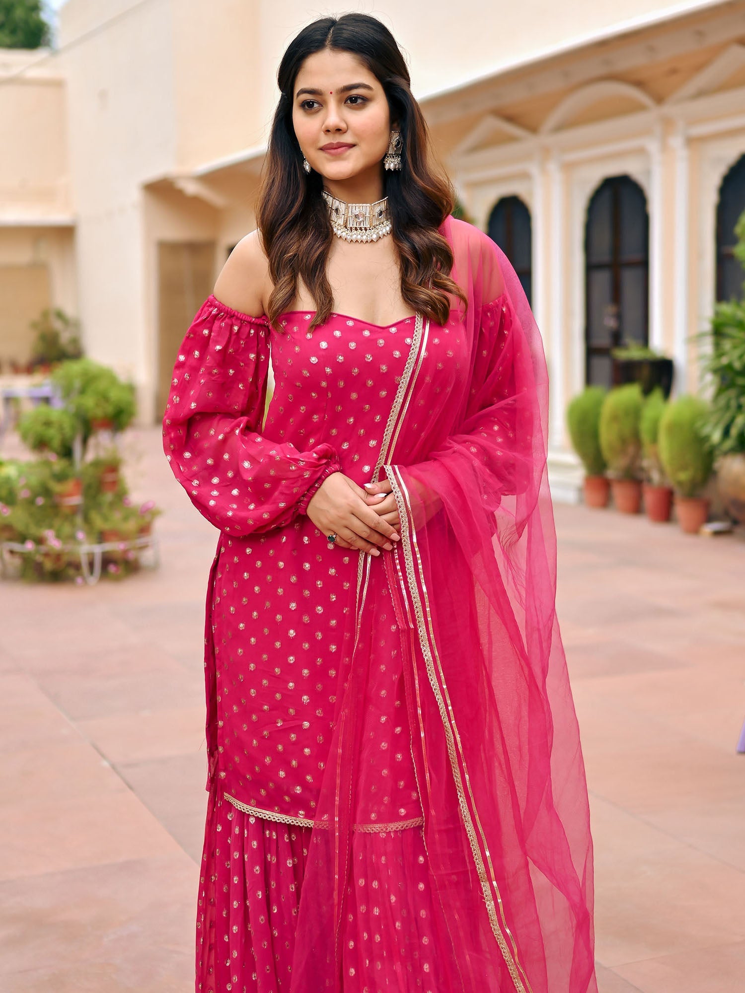Radiate elegance in our Pink Georgette Sharara Set – a captivating ensemble that blends grace with contemporary style. Crafted from lustrous georgette, this set features a flared sharara bottom paired with a beautifully adorned kurta, exuding charm and sophistication in every detail. Perfect for those who seek a perfect fusion of tradition and modern allure.