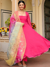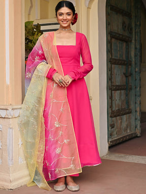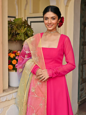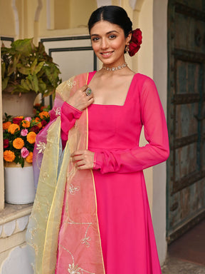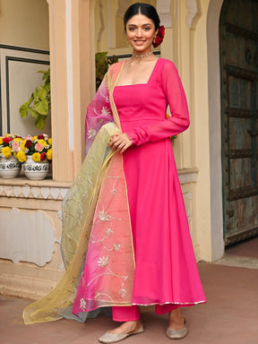 A pink georgette Anarkali set would feature an Anarkali-style dress made of georgette fabric in varying shades of pink.
