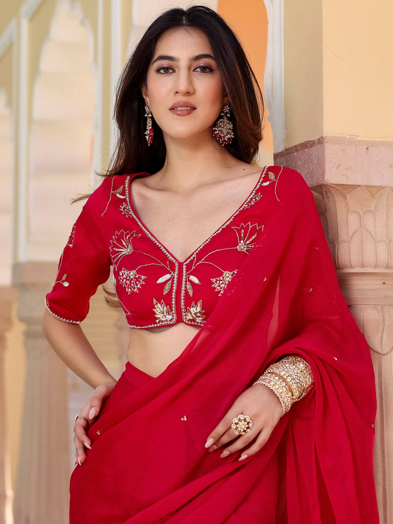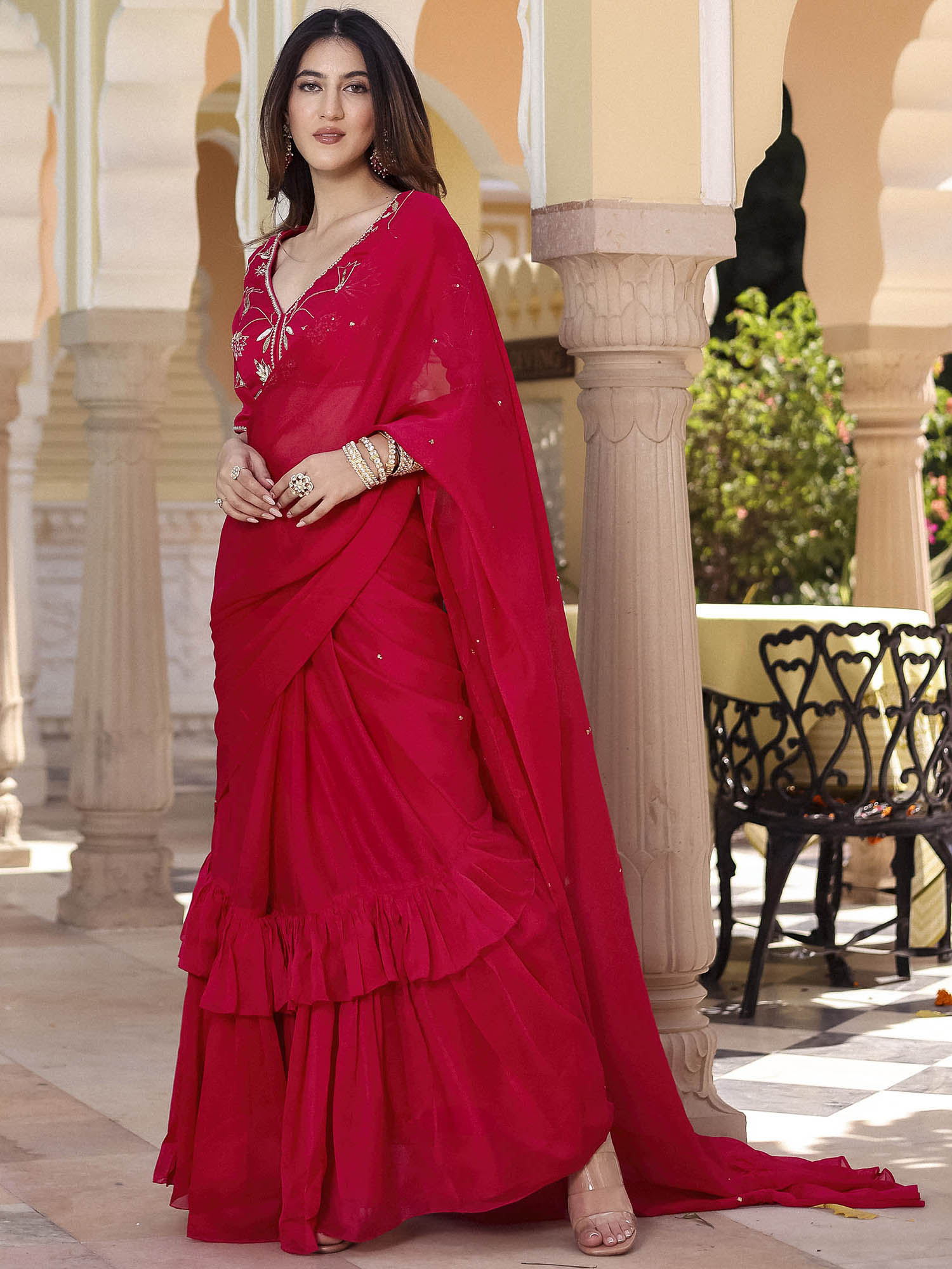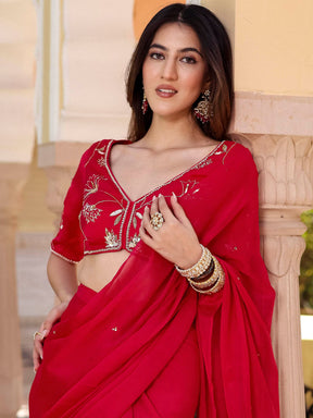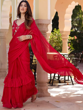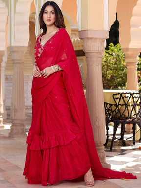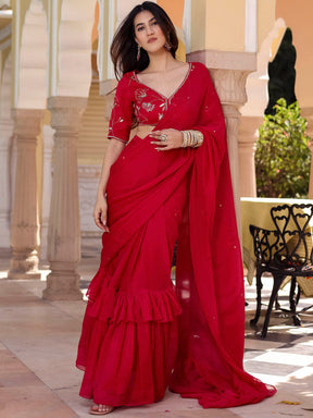 Radiate timeless elegance in this RED Pre-Draped Saree, a symphony of grace and charm. With its meticulously draped silhouette and delicate hues, it effortlessly combines tradition and contemporary allure, making every moment a celebration of style.