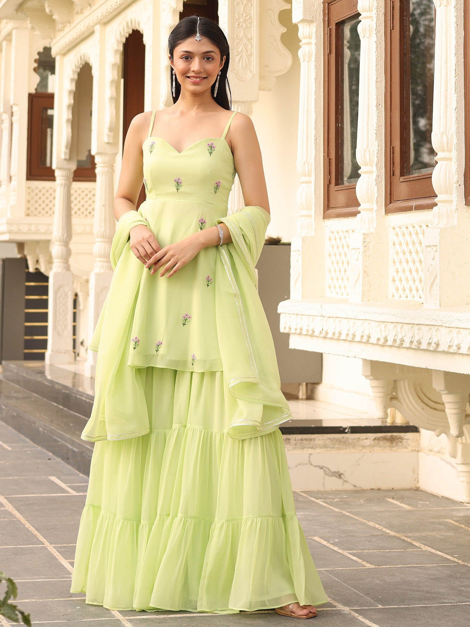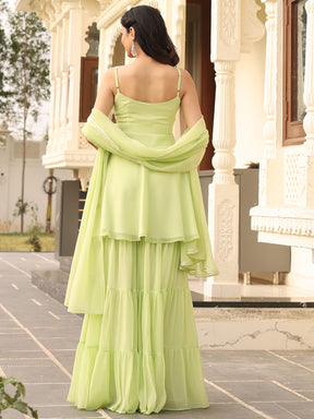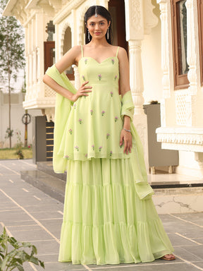 A stylish Georgette Green sharara set featuring intricate machine-embroidered floral placements, designed with a clean, classy silhouette. The flared sharara boasts modern cuts that add a contemporary touch, while the dupatta is delicately finished with a very thin gotta lace, enhancing its elegance. The ensemble perfectly balances traditional elements with modern design sensibilities.