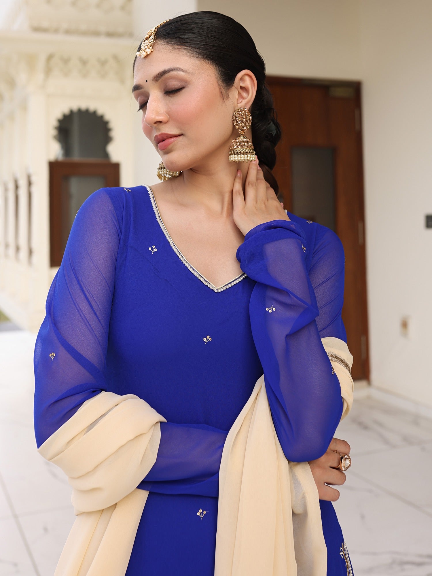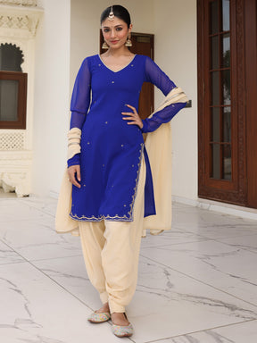 This Georgette Patiala set is a stunning ensemble, designed in a striking Royal Blue & Beige contrast of colors that exudes elegance and charm. The Royal blue kurta is beautifully adorned with intricate zari and sequin work in both gold and silver, adding a rich shimmer to the outfit. Delicate pearl handwork enhances the hemline and neckline, lending a touch of grace and sophistication. The Patiala bottoms complement the kurta perfectly, offering a traditional yet stylish look. Completing the ensemble is a flowy dupatta, finished with a gorgeous golden lace border that adds to the overall regal appeal. Ideal for festive occasions or special gatherings, this set effortlessly blends traditional craftsmanship with contemporary flair.