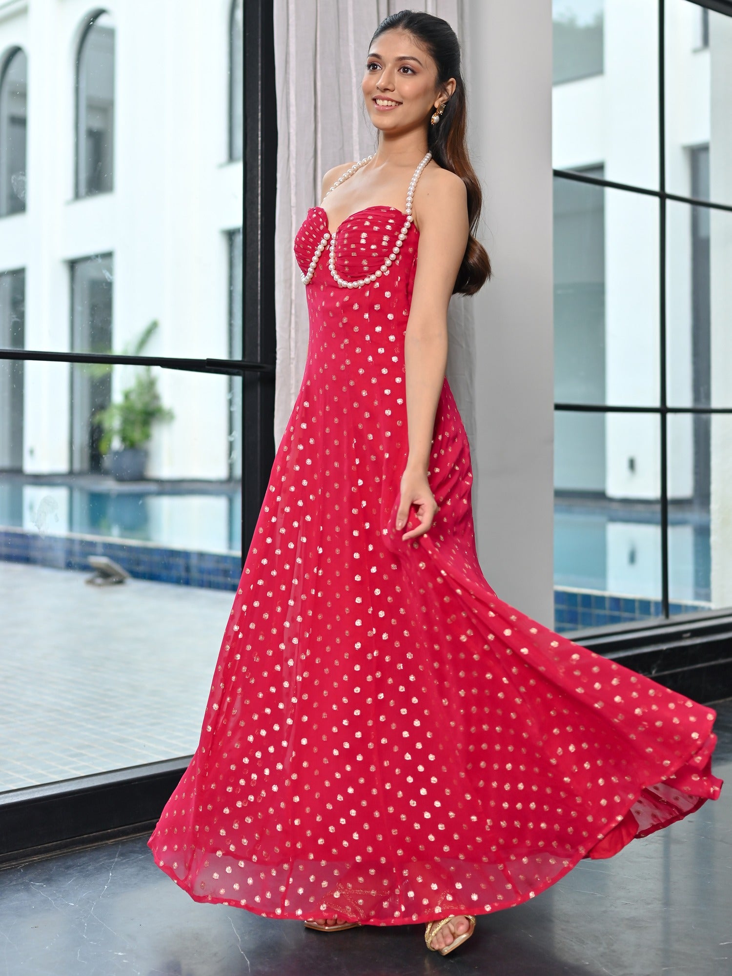 Unveil your inner goddess with our Pink Jacquard Long Maxi Dress . This stunning piece features a flattering sweetheart neckline that enhances your silhouette, . The delicate pearl tie-up straps provide an adjustable fit and a charming detail, perfect for any occasion. Whether you’re attending a sundowner party or a romantic dinner, this maxi dress flows beautifully with every movement, ensuring you stand out in style. Pair it with your favorite heels and statement jewelry for a chic, effortless look!