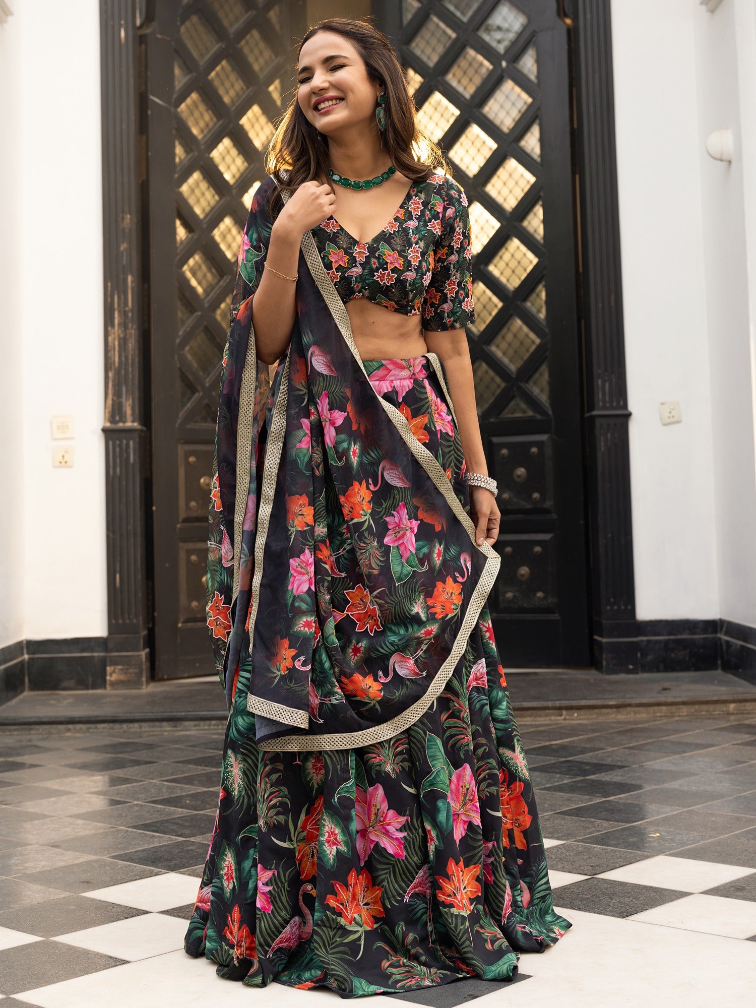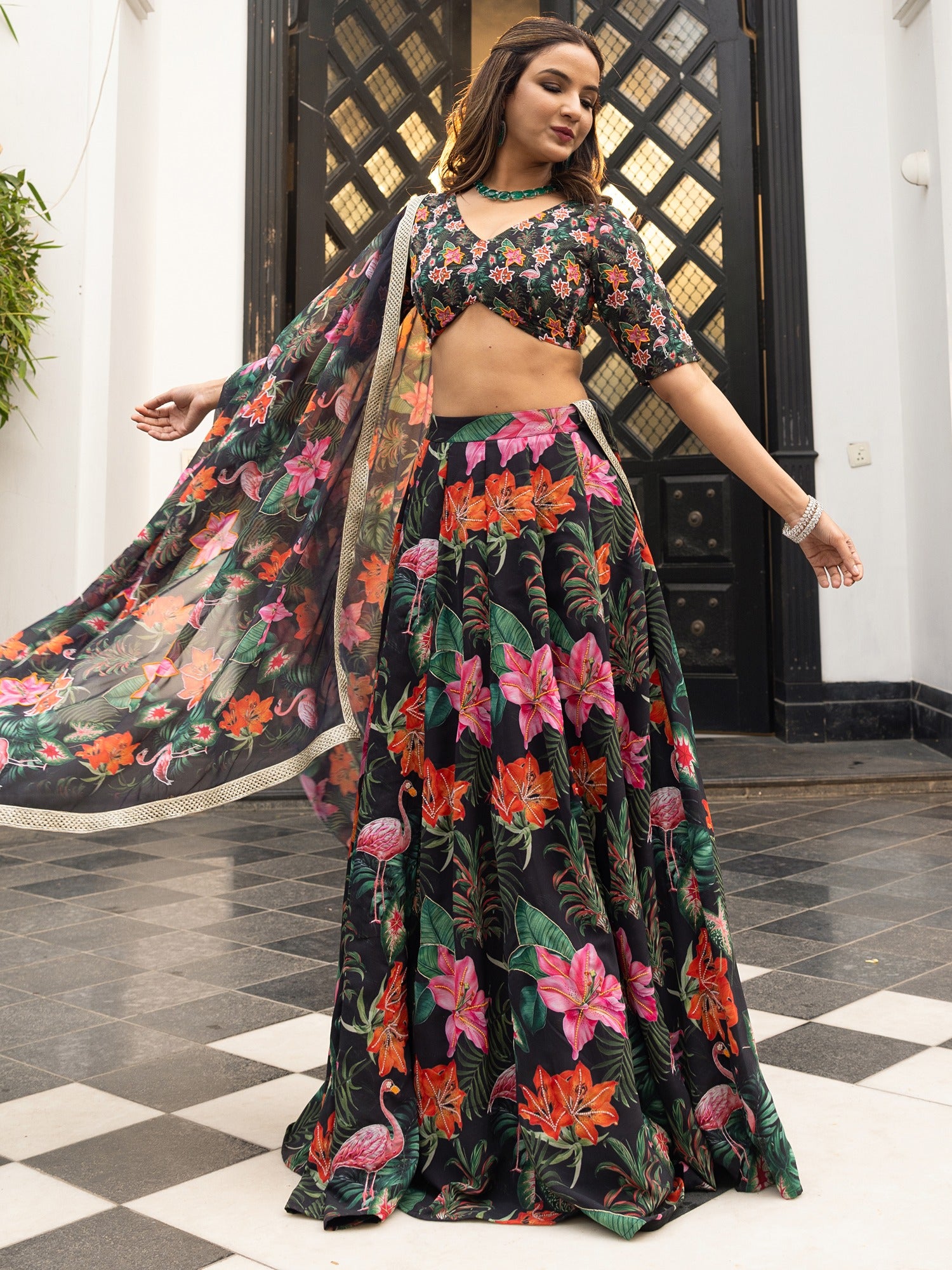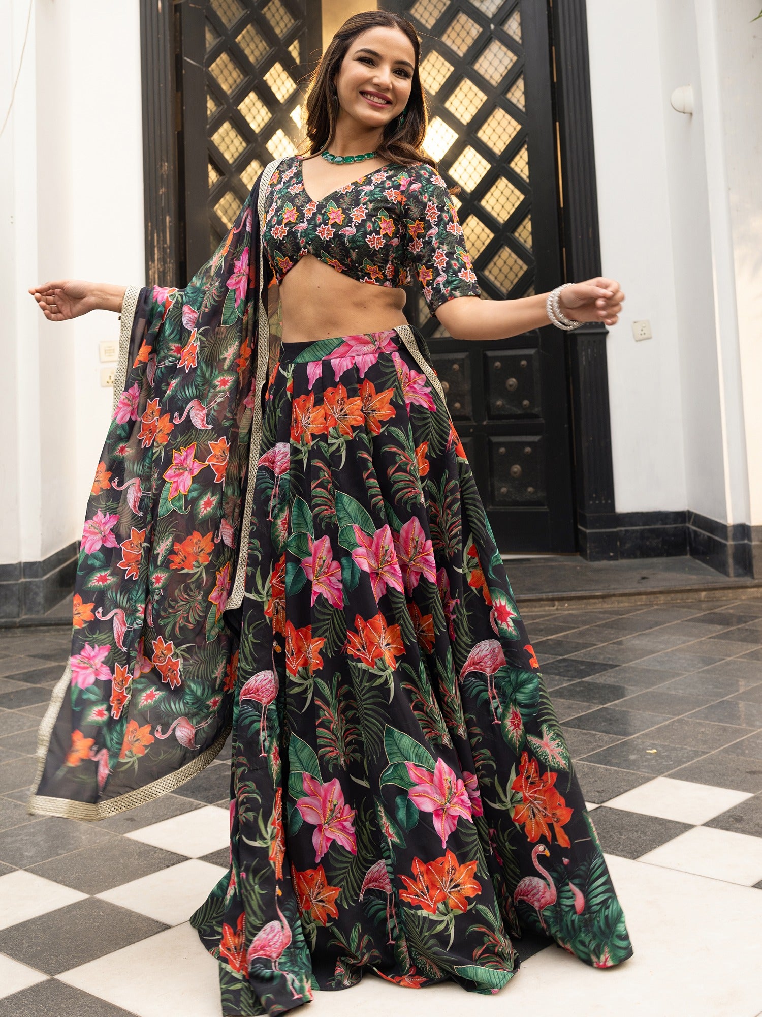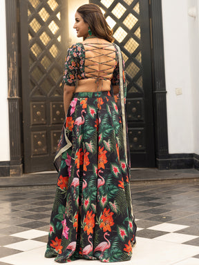 Black Lehenga set features a vibrant tropical print with a beautiful blend of floral and fauna motifs, enhanced by a striking flamingo design. The rich, exotic prints are complemented by contrasting handwork that adds a touch of elegance and depth. The fusion of traditional ethnic styling with modern tropical elements creates a unique, fresh look, combining intricate embroidery and vibrant patterns for a stunning and stylish ensemble.