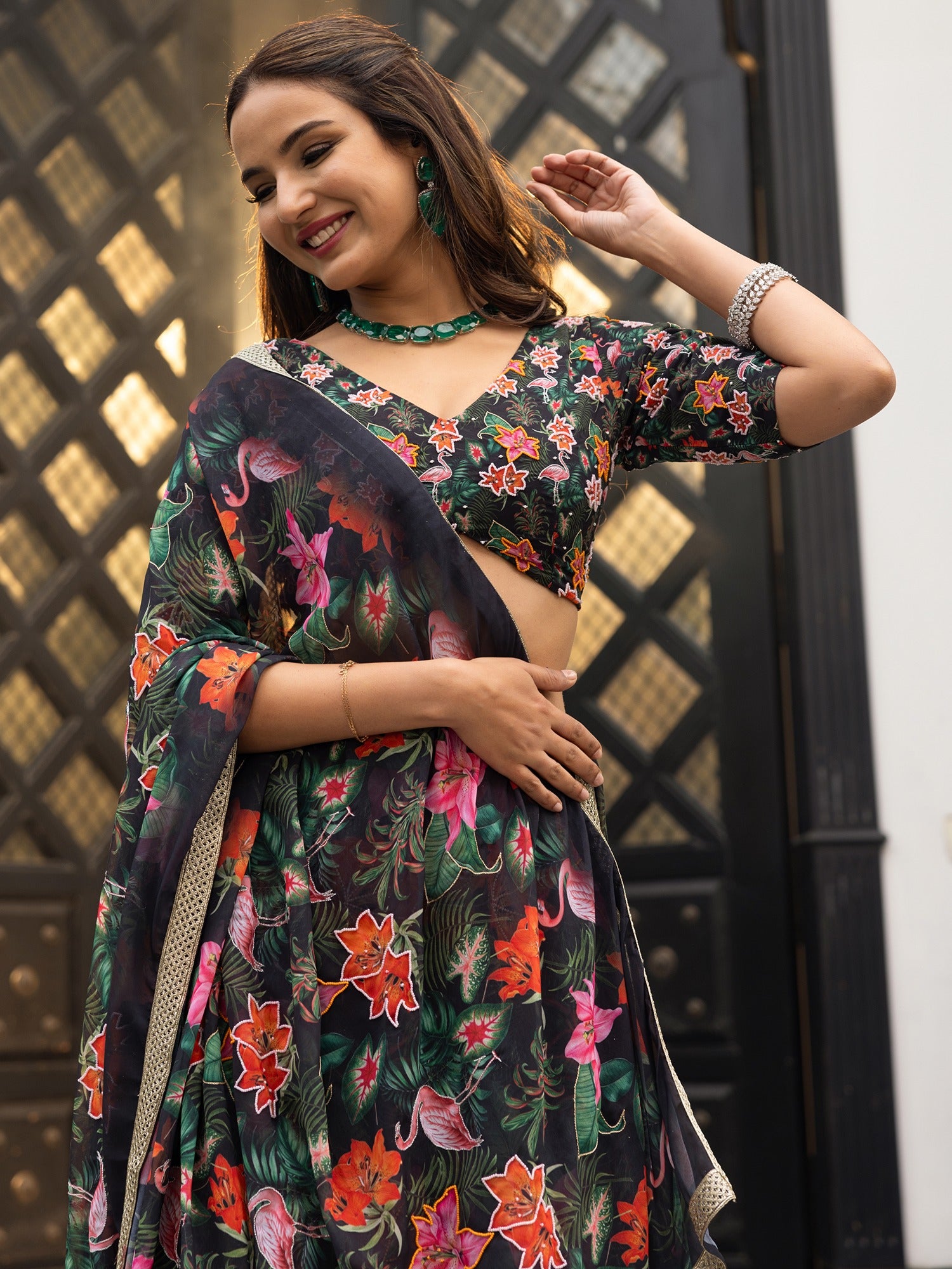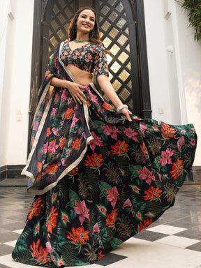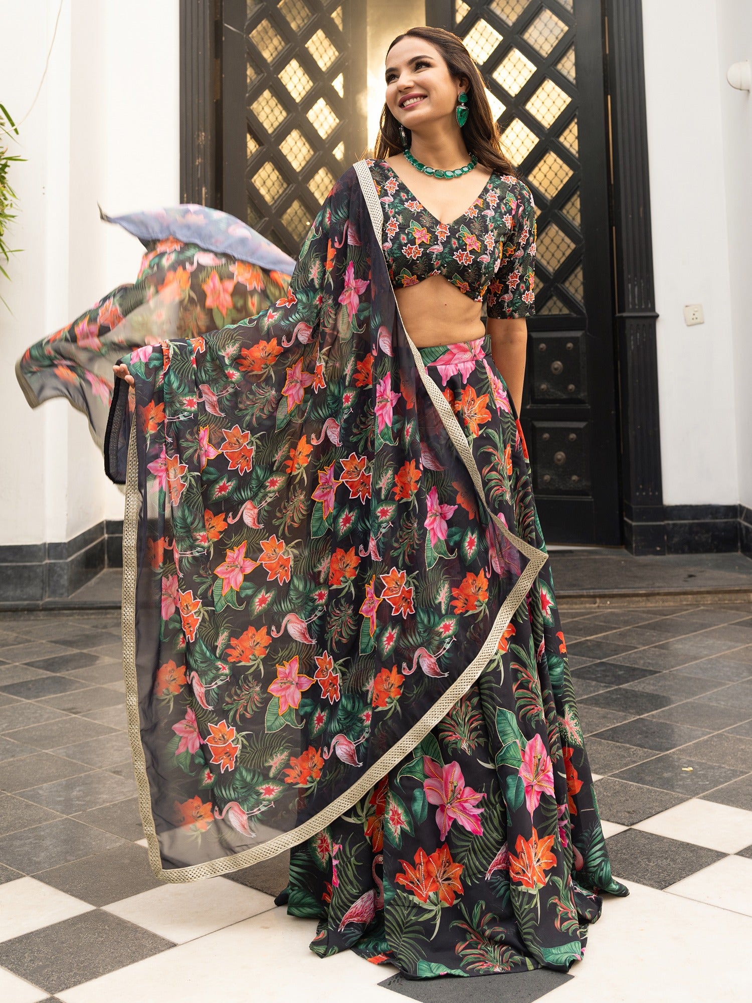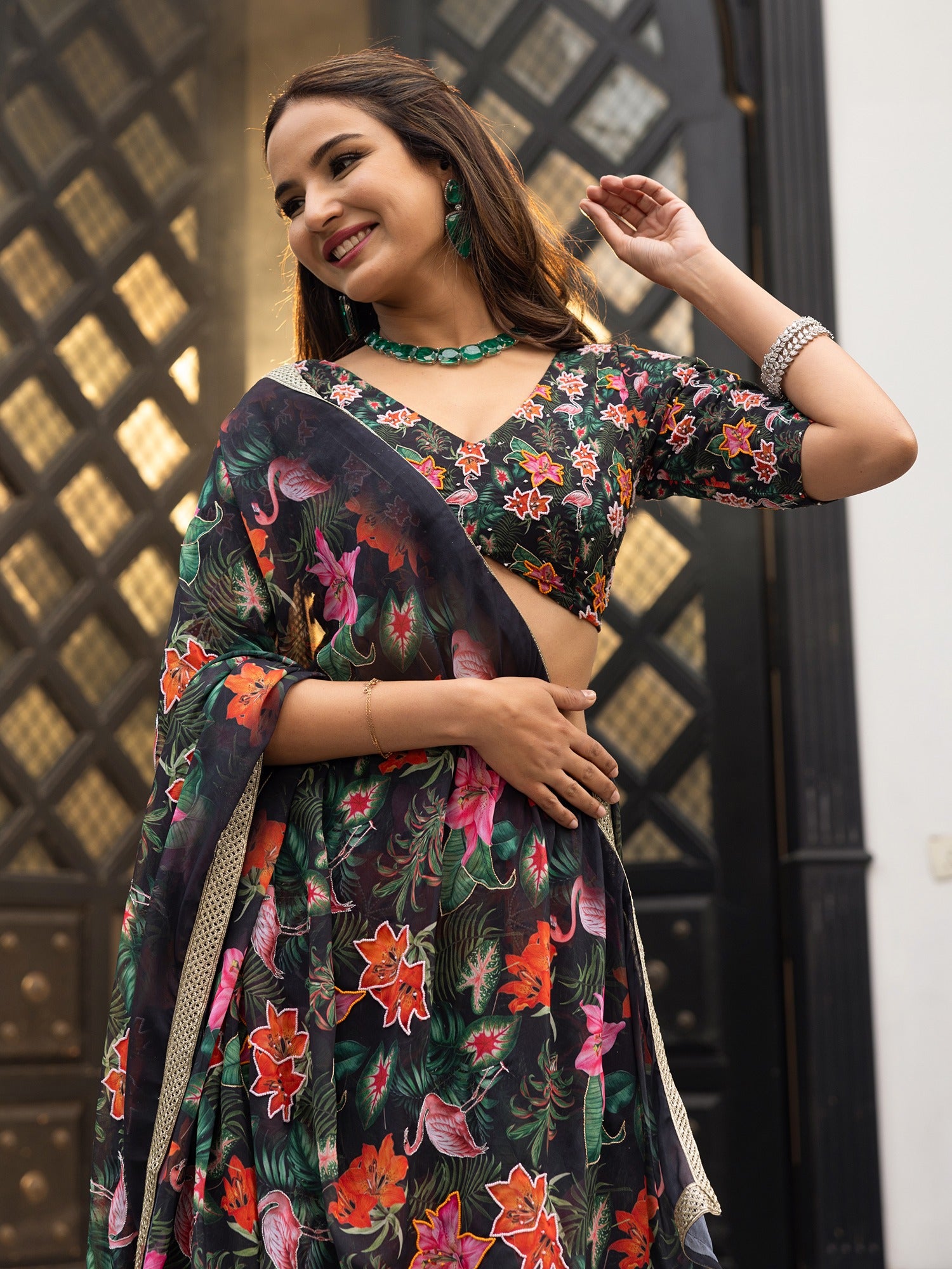 Black Lehenga set features a vibrant tropical print with a beautiful blend of floral and fauna motifs, enhanced by a striking flamingo design. The rich, exotic prints are complemented by contrasting handwork that adds a touch of elegance and depth. The fusion of traditional ethnic styling with modern tropical elements creates a unique, fresh look, combining intricate embroidery and vibrant patterns for a stunning and stylish ensemble.