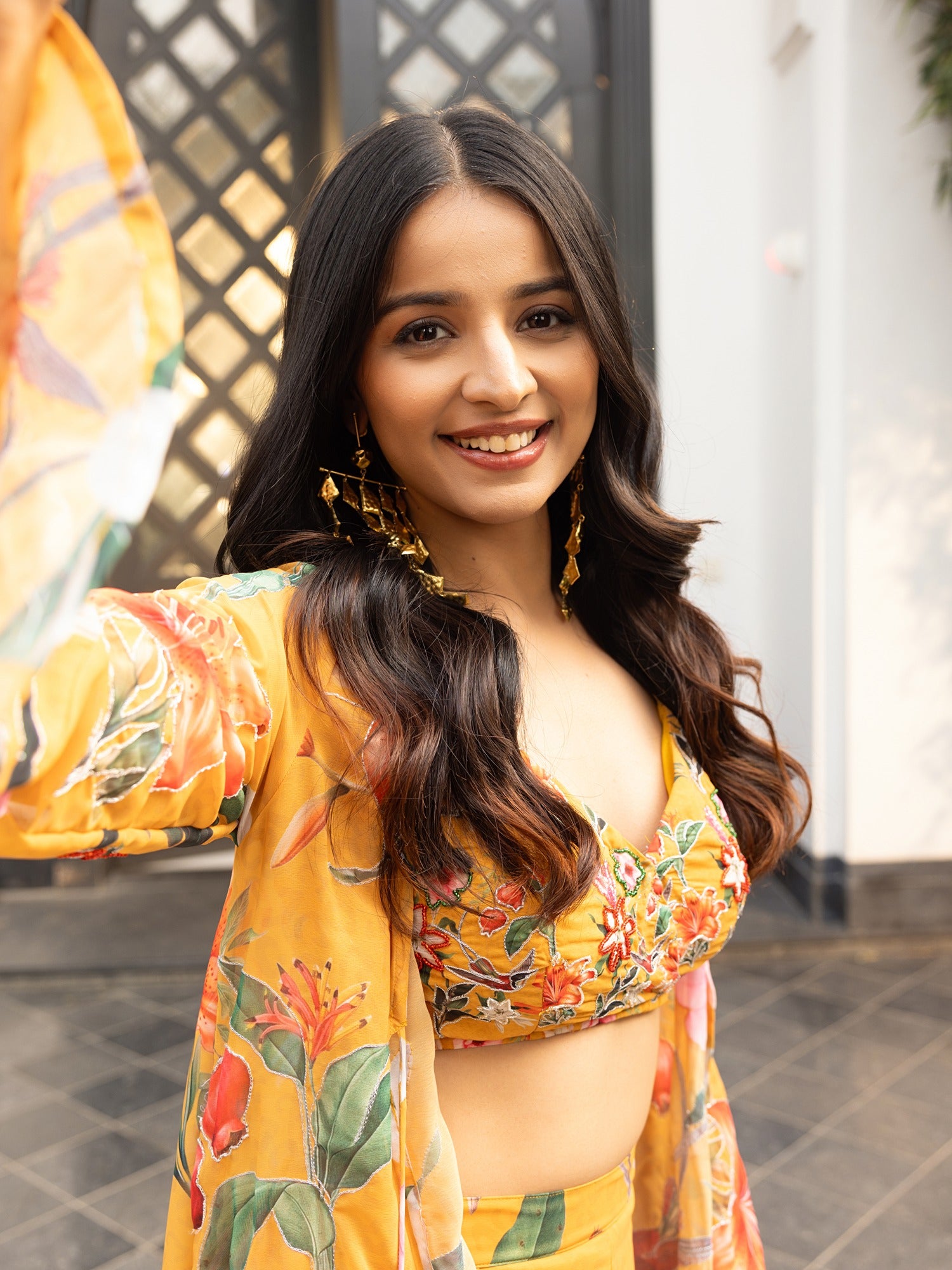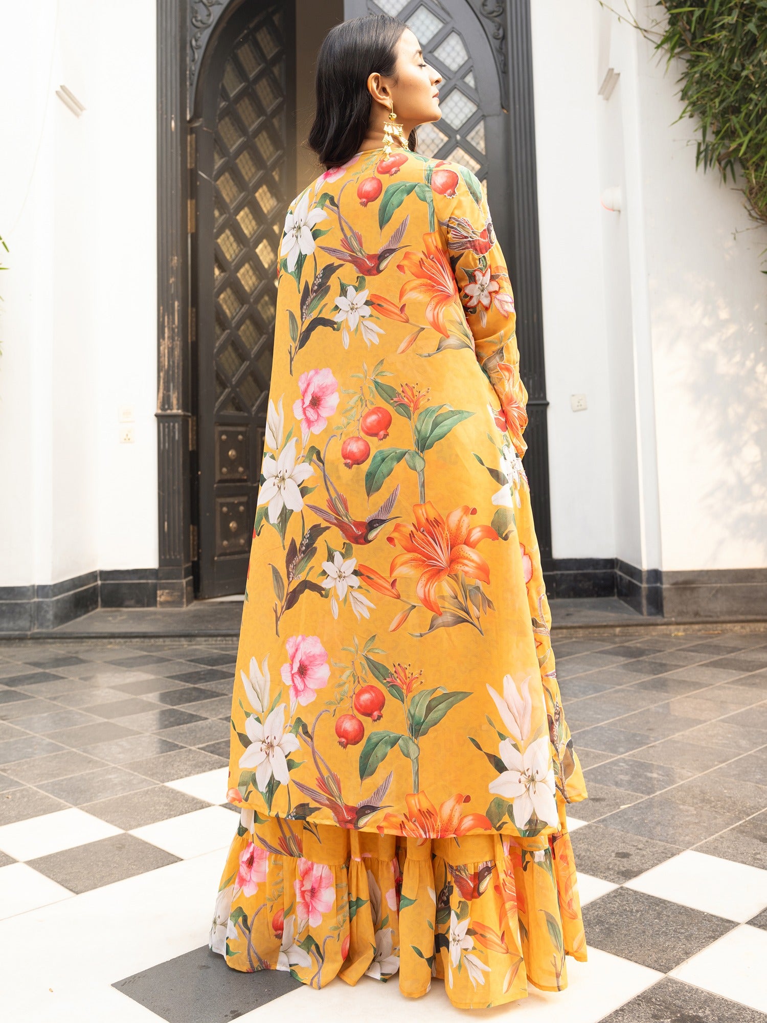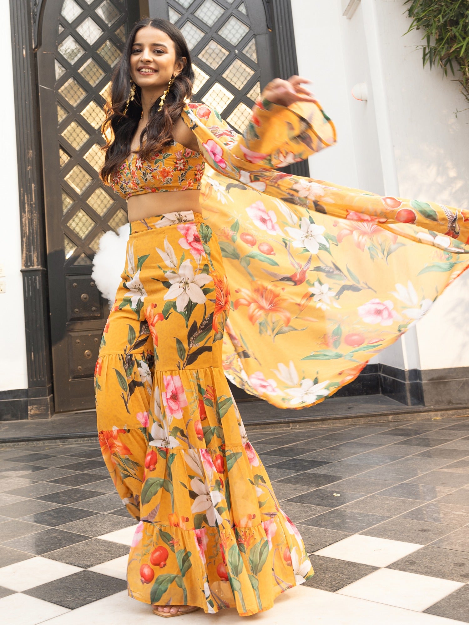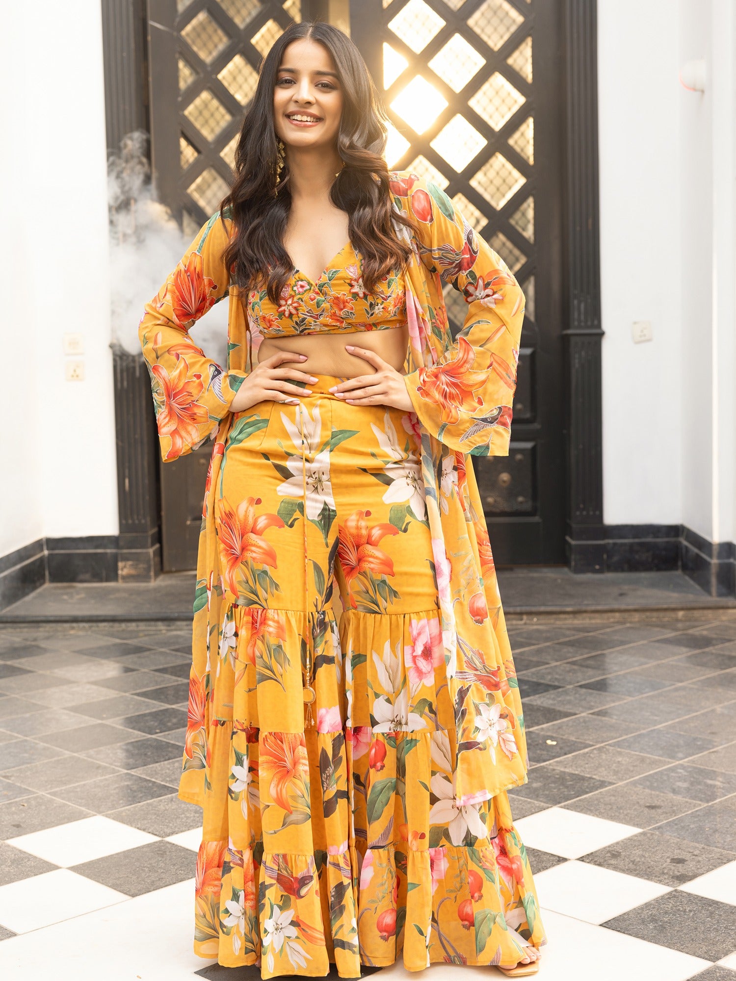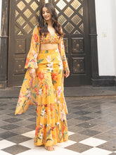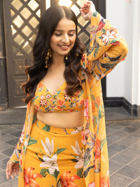 This Mustard Trio set beautifully combines traditional and contemporary elements. The fabric features an intricate print of birds and colorful flowers, creating a vibrant and lively effect. The soft beige backdrop allows the bold colors to pop, while delicate handwork highlights add an extra layer of elegance. The fusion of timeless ethnic design with playful, modern prints results in a sophisticated yet fresh look, making this set is perfect for those seeking a blend of classic charm and contemporary flair.