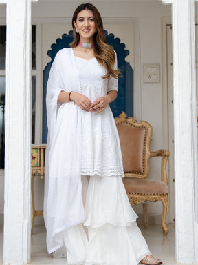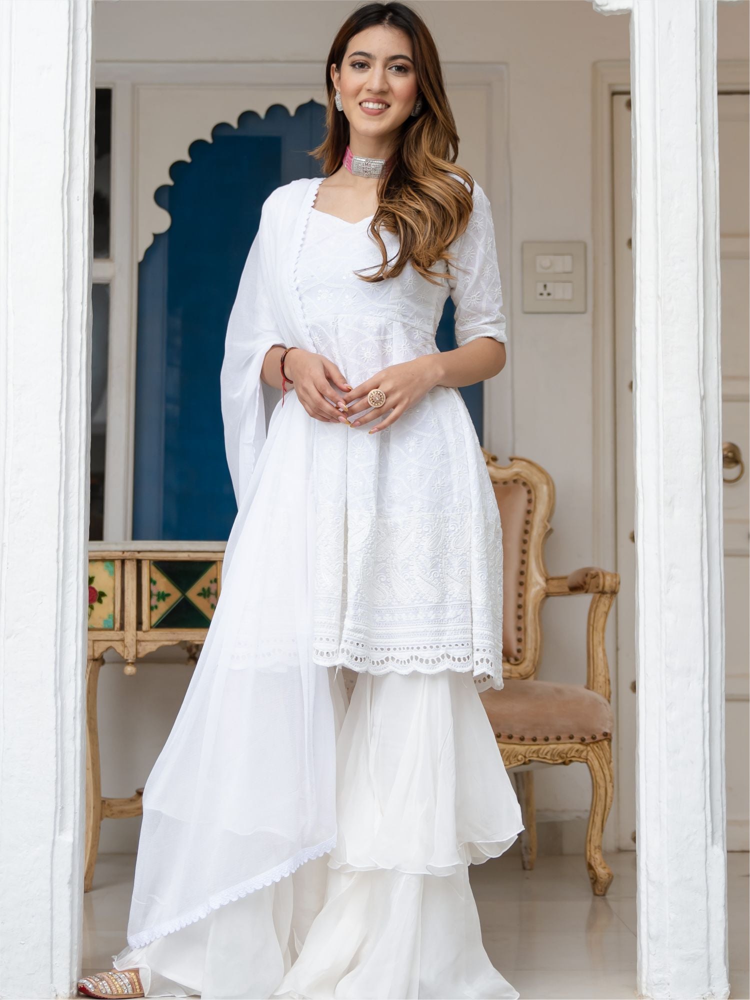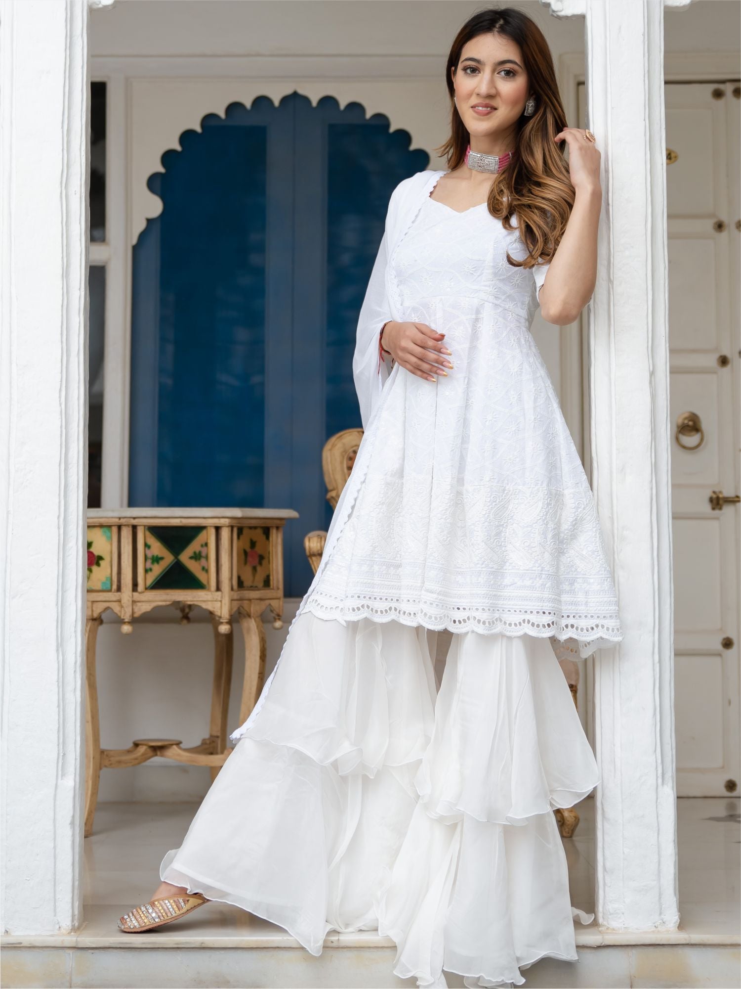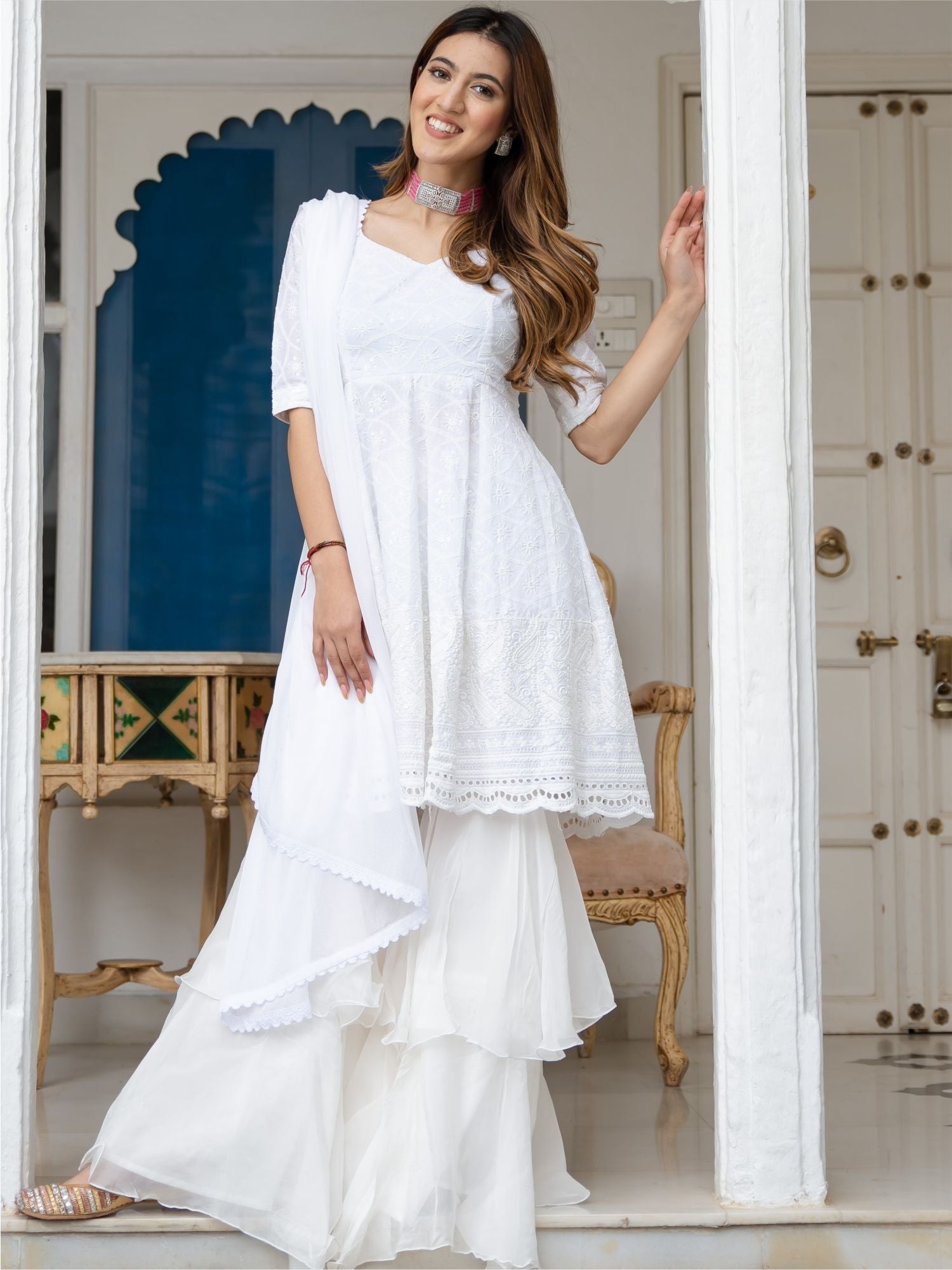 White Cotton Embroidered Short Kurta and Tiered sharara