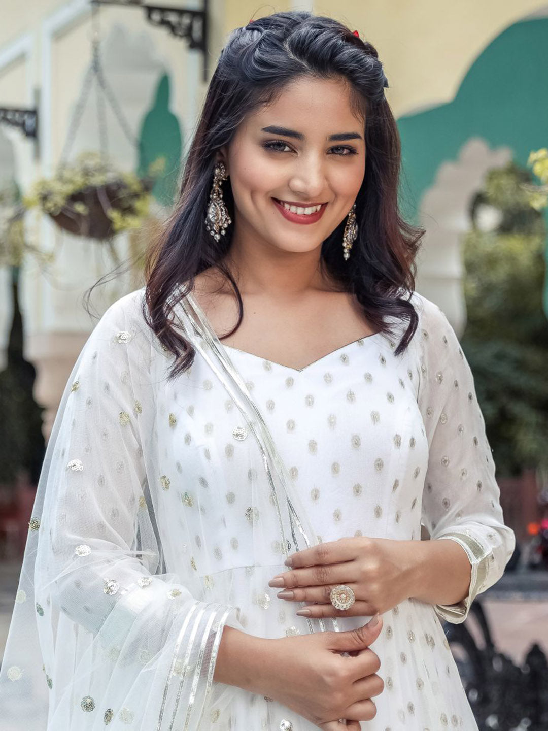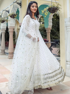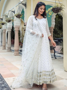 Elegant and timeless, this White Georgette Anarkali Set exudes grace with its flowing silhouette and intricate detailing. Adorned with delicate embroidery, the set captures the essence of sophistication, making it a perfect choice for any special occasion.