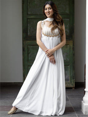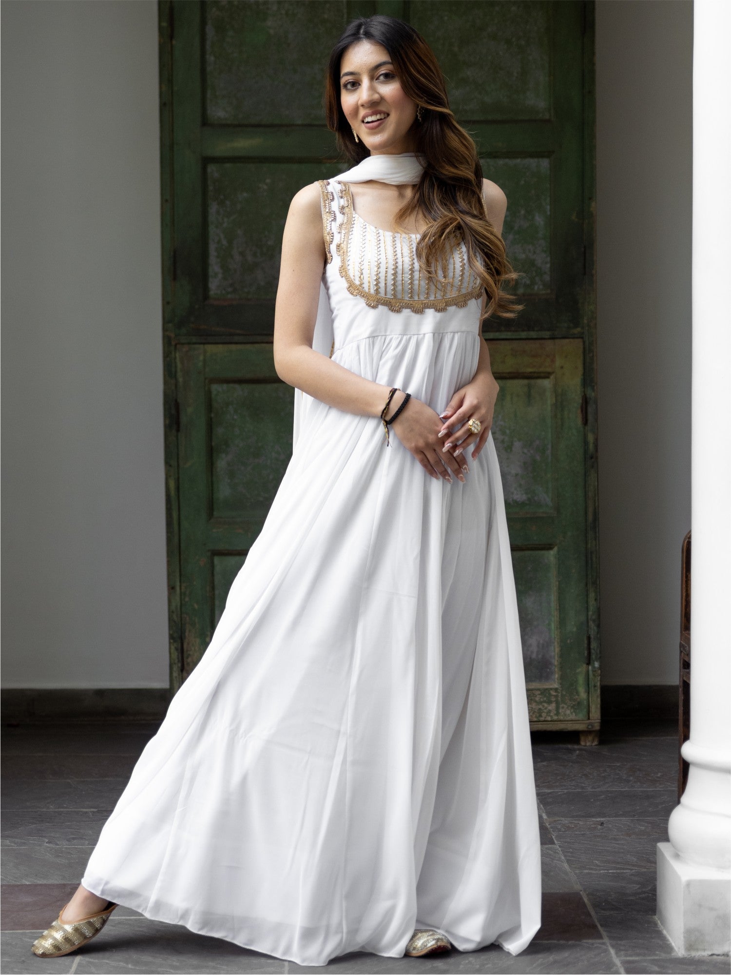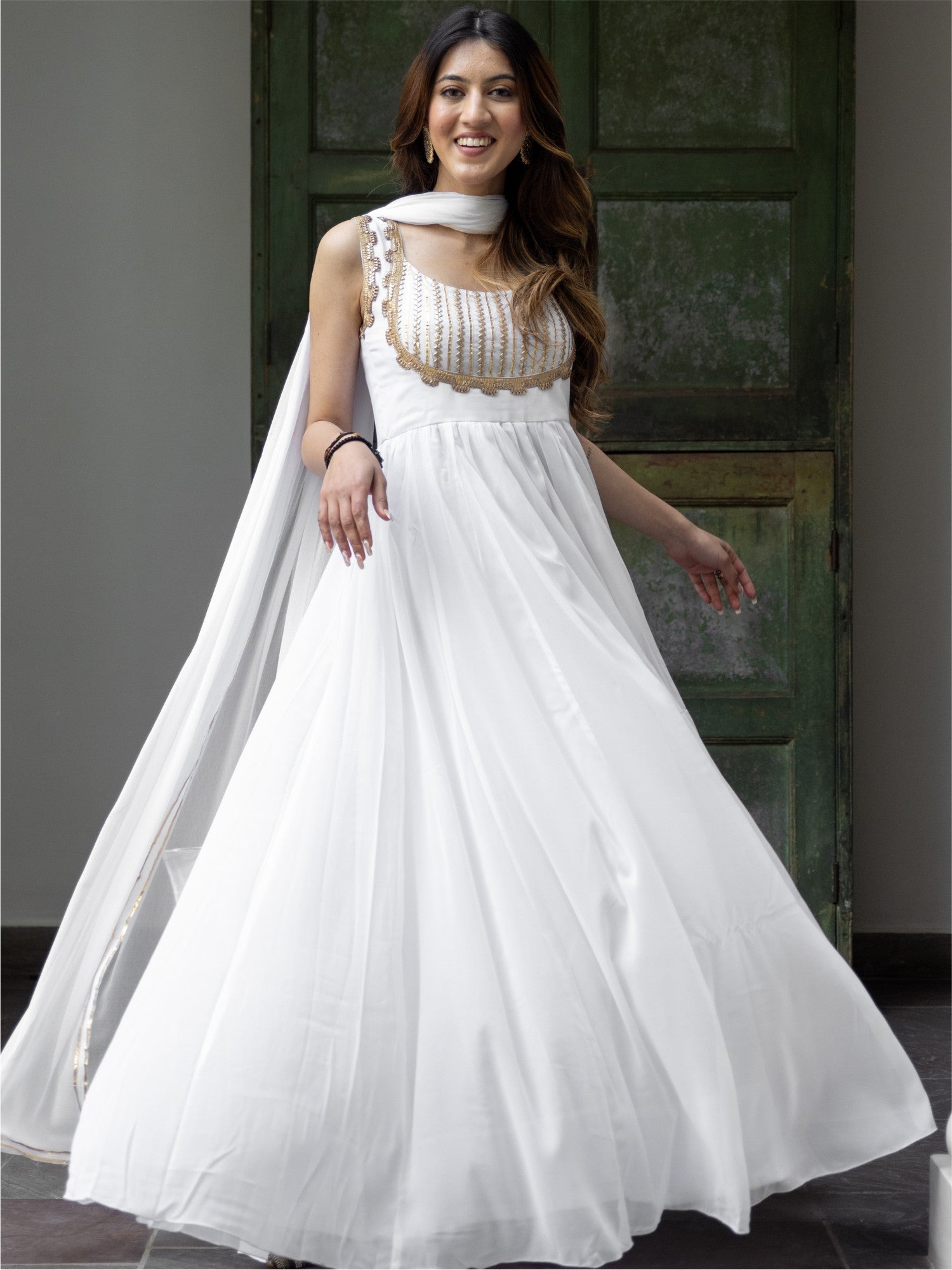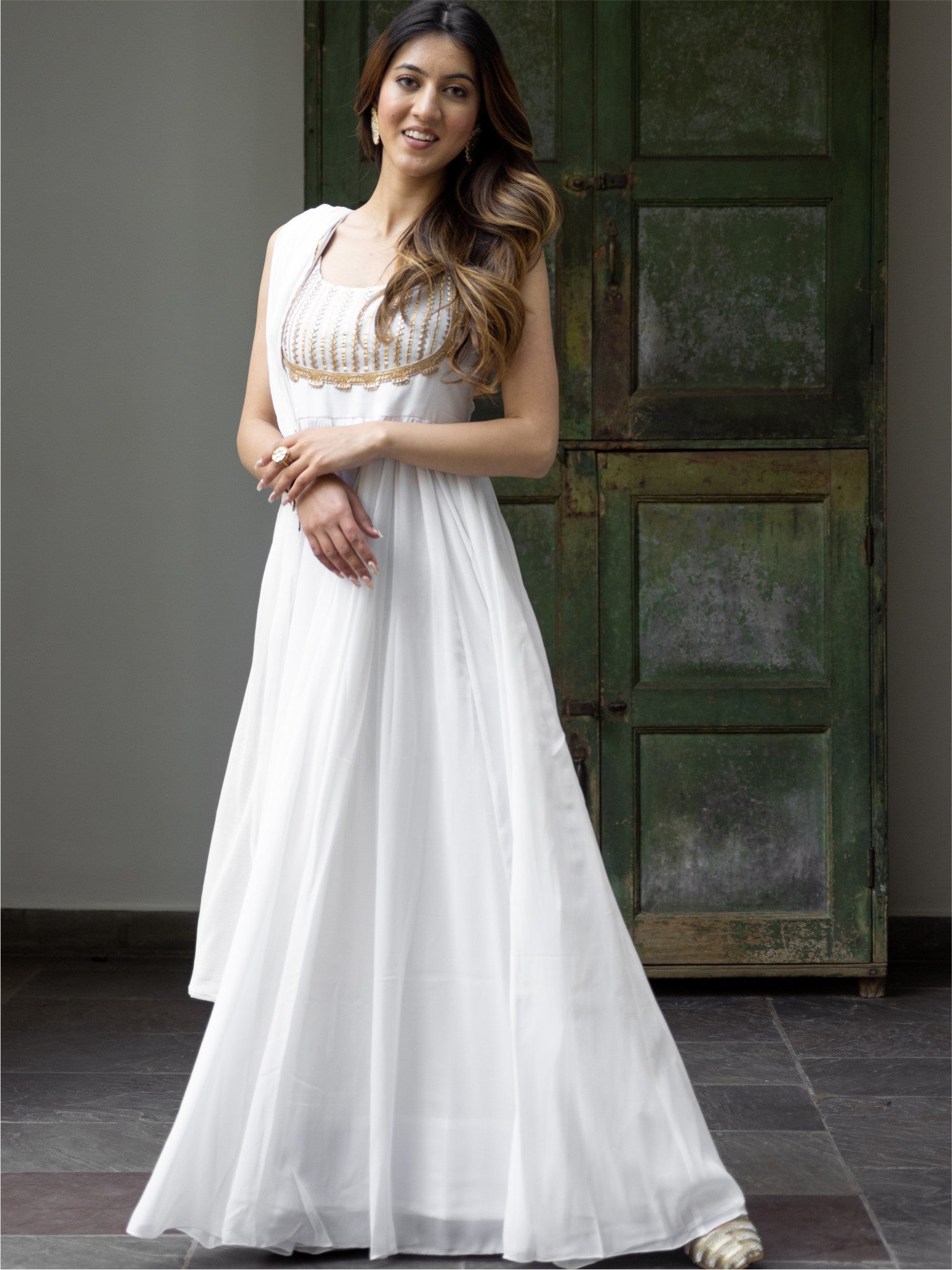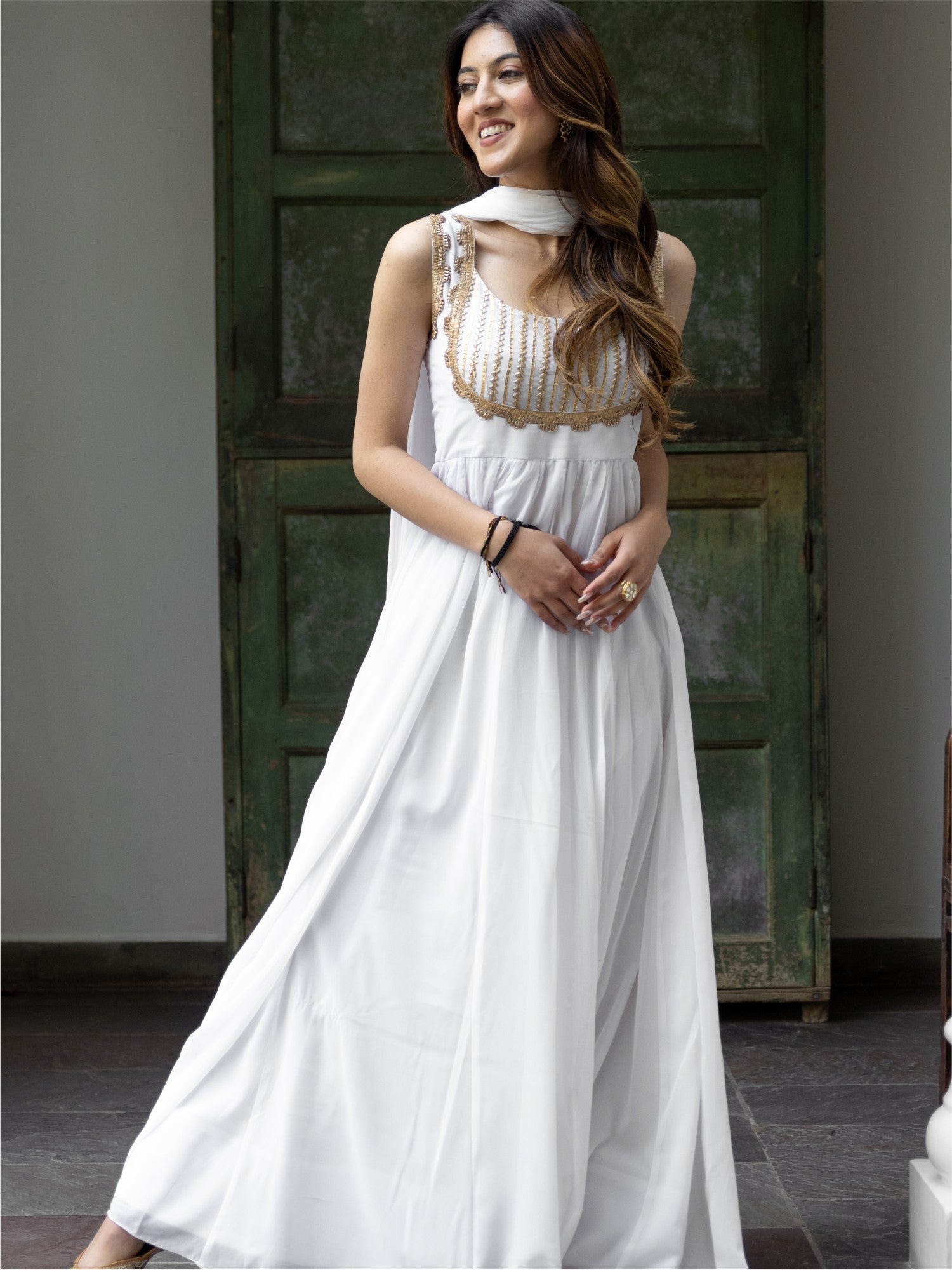 Elegant and timeless, our White Georgette Long Dress Set embodies grace and sophistication. Crafted from luxurious georgette fabric, this ensemble features a flowing silhouette that exudes both comfort and style. The pristine white hue adds a touch of purity, making it a captivating choice for any special occasion. Elevate your presence with this effortlessly chic and versatile dress set.