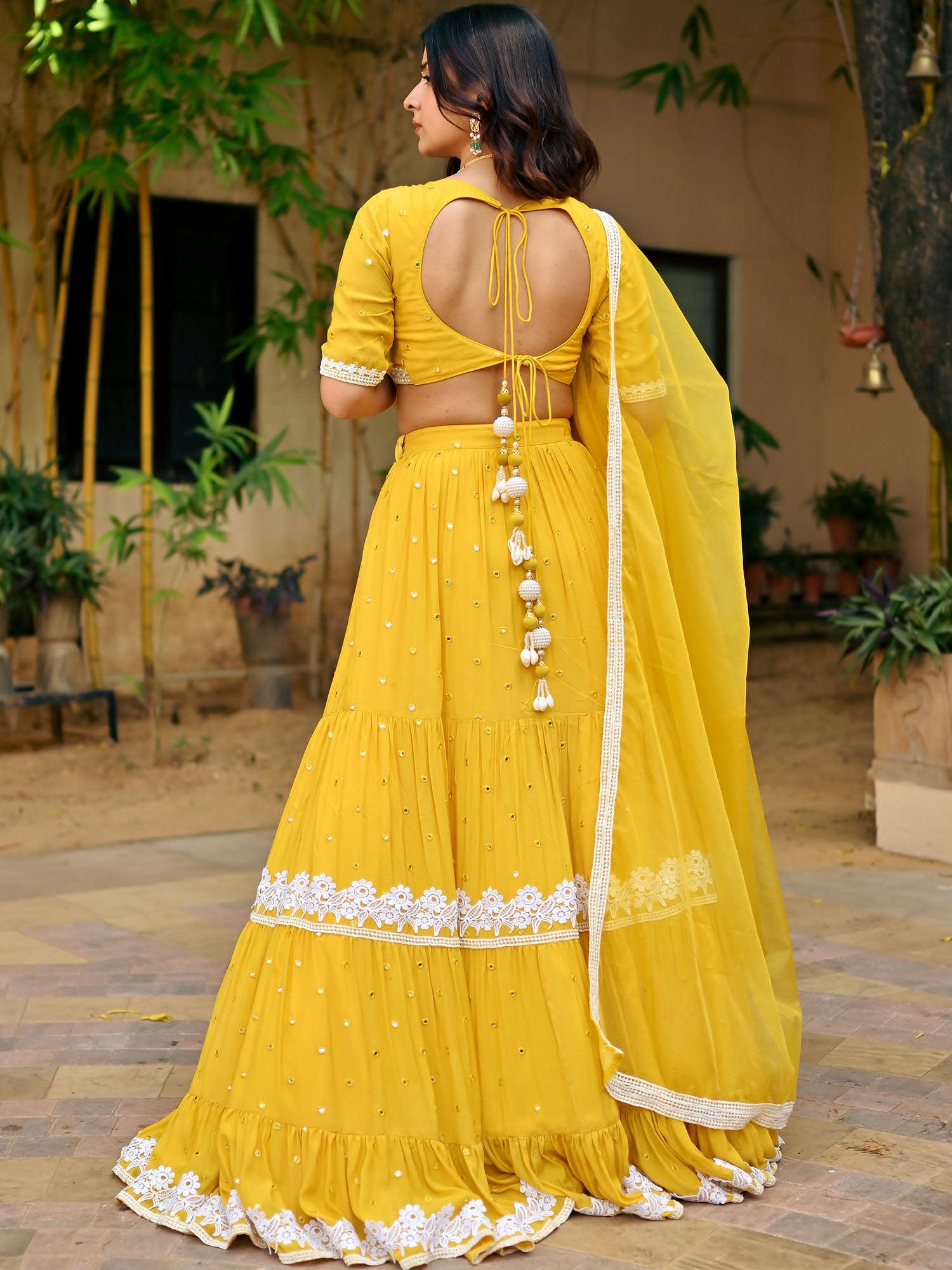 Illuminate the Festive Season in our Yellow Mirror Lehenga Set. The V-neck design, elbow-length sleeves, regular fit, and intricate embroidery showcase timeless elegance. With a convenient hook-eye closure and high-rise grace, this ensemble is adorned with mesmerizing mirror work, ensuring you shine bright at every celebration.