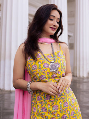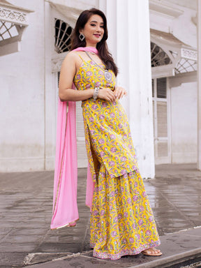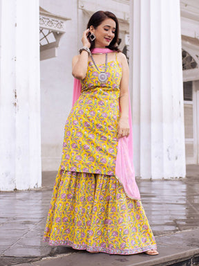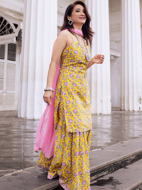 Radiate sunshine in this vibrant yellow printed suit set, a perfect blend of elegance and cheerfulness. Embrace the warmth of golden hues with intricate patterns, making a bold and stylish statement wherever you go.